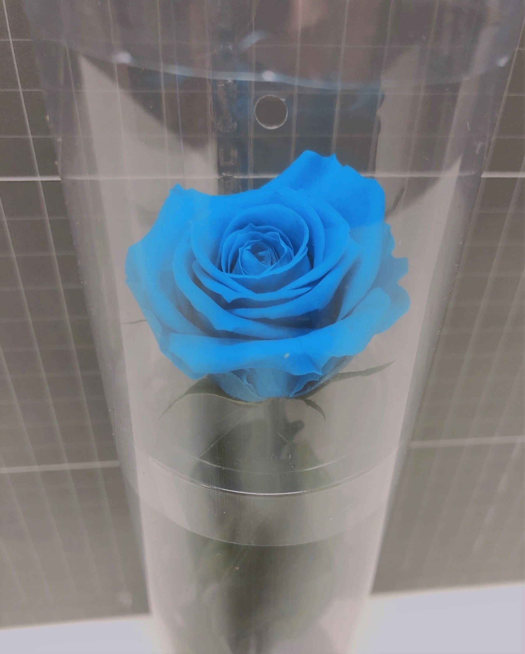 青いバラは生花では見られないプリザーブドフラワーはならではの色です。このプリザーブドフラワーは国内随一のプリザーブドフラワー花材卸販売会社であるモノ・インターナショナル株式会社(東京都北区、代表取締役社長 草野 家継)にご協力いただき、バラ一輪ずつが透明の美しいケースに収納されています(上代2,310円相当)。