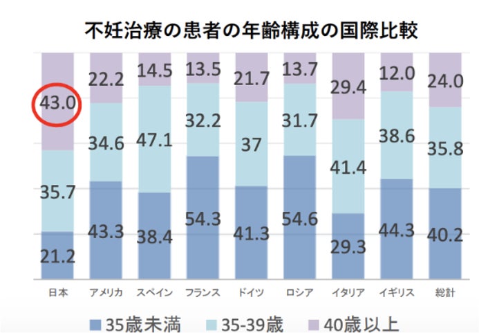 不妊治療を受ける患者の年齢を見ると、43%が40歳以上という結果が出ています。また、高度生殖医療の妊娠率及び出生率に関しては、日本の治療成績は非常に低くなっています。(※2,3)これらは日本での性教育や妊孕性への理解が不十分で、身体や妊娠についての正しい知識を得る機会が少なく、その結果、検査や治療を受け始めるのが遅くなるなど、多くの人が適切な治療を受ける機会を失っているためと考えられます。