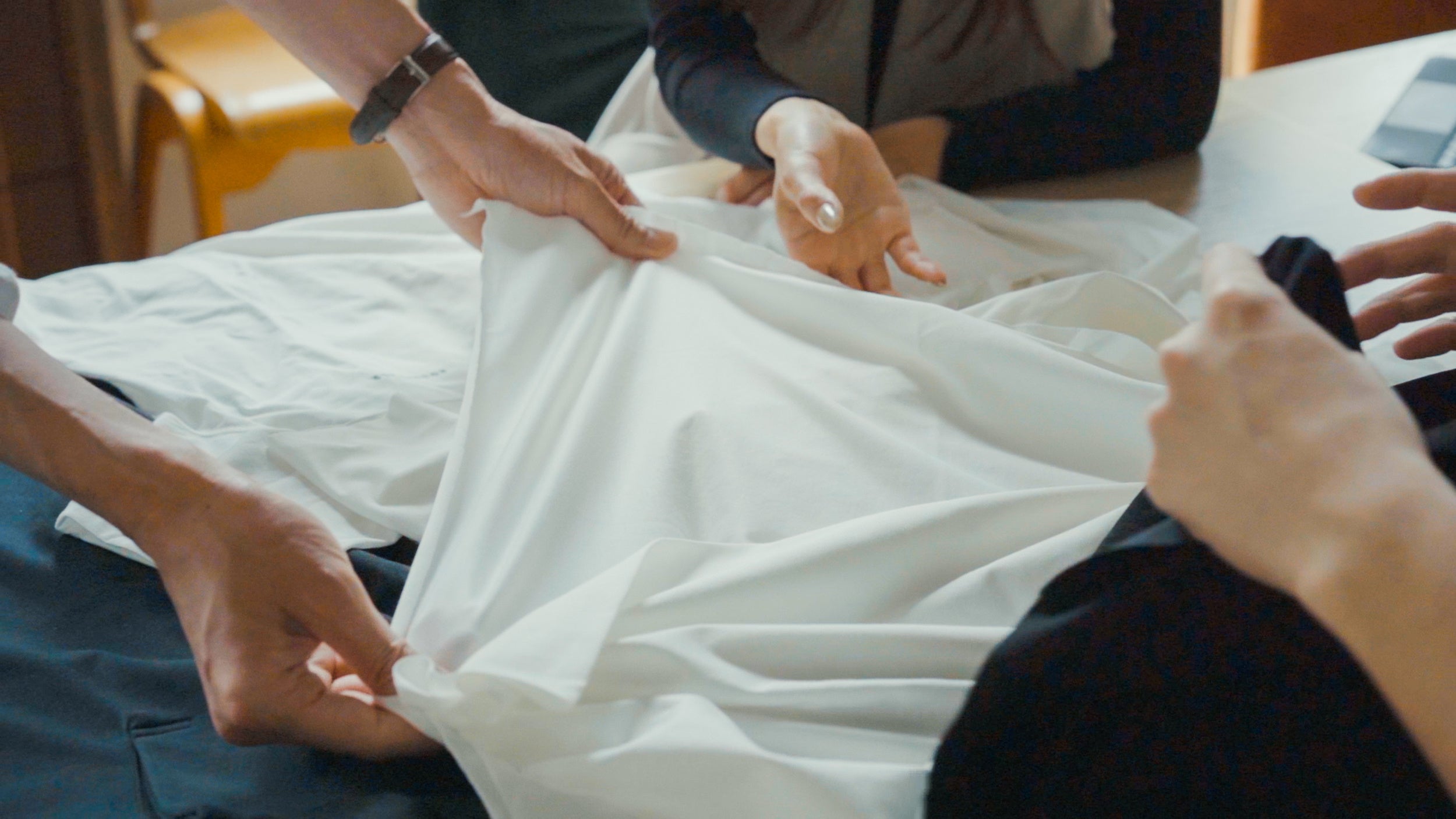 世界三大超長綿のシーアイランドコットンと螺旋分子構造を施した特殊ファイバーの糸を仕入れ、日本の高度な紡績、編立技術によってこれら2種類の糸をハイブリッドした生地を1年の試行錯誤の末に完成させました。