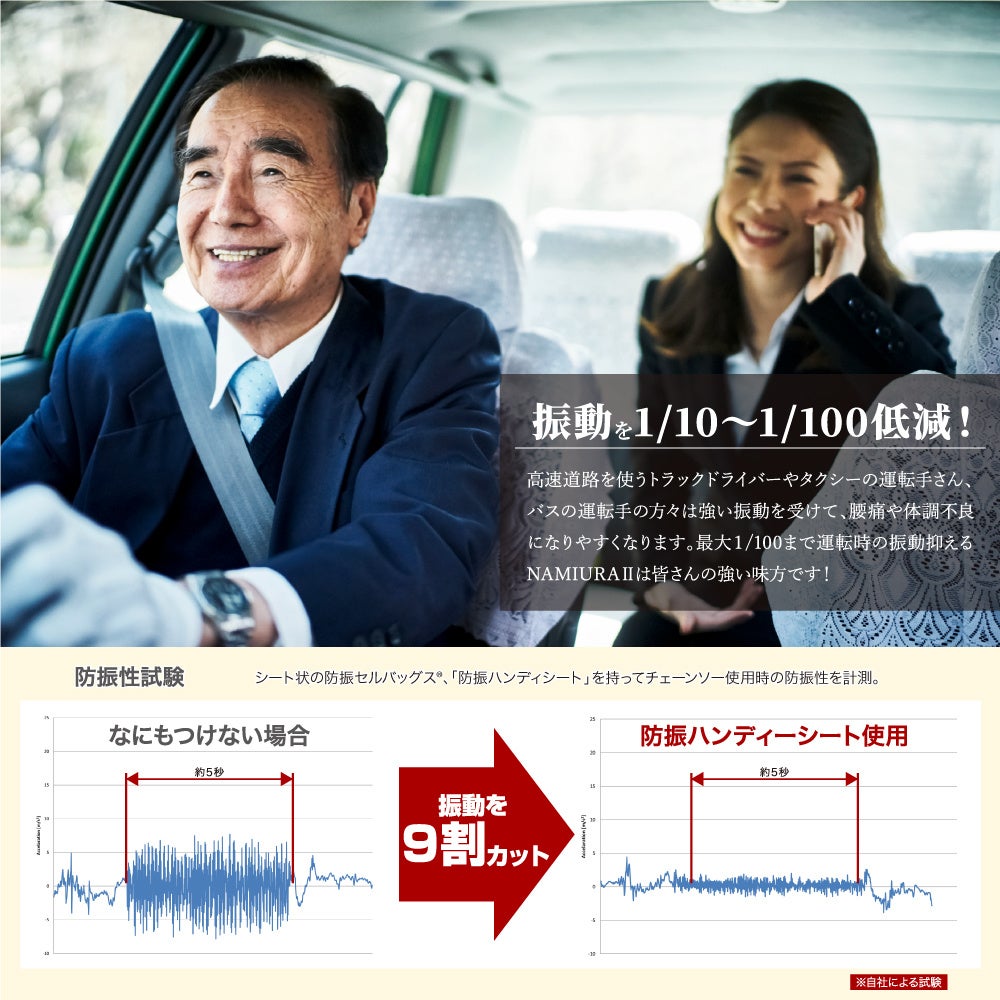 「NAMIURA2」をはじめセルバッグスの防振性試験では、振動の約9割をカットできることを実証しており、自動車運転時に起きる振動を1/10から最大1/100まで軽減することができます。