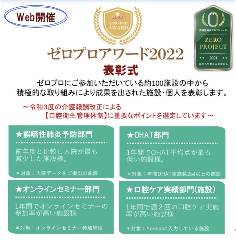 当社が推進している「誤嚥性肺炎ゼロプロジェクト®(以下、ゼロプロ)」において成績優秀事業者および個人を表彰する初の試みとして「ゼロプロアワード2022」を2022年5月13日(金)にオンラインにて開催します。ゼロプロアワードは、誤嚥性肺炎ゼロプロジェクトの普及と良質な介護事業所の見える化を目的に立ち上げられ、今回が初開催となります。
