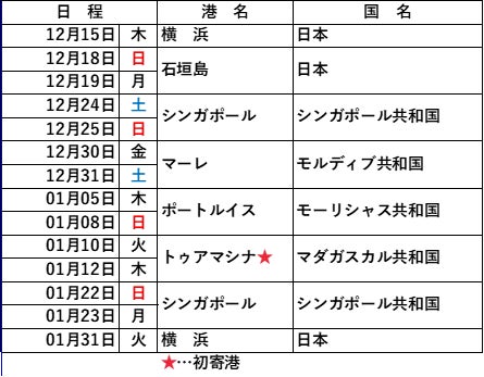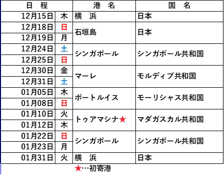 寄港地:石垣島(日本)、シンガポール(シンガポール)、マーレ(モルディブ)、