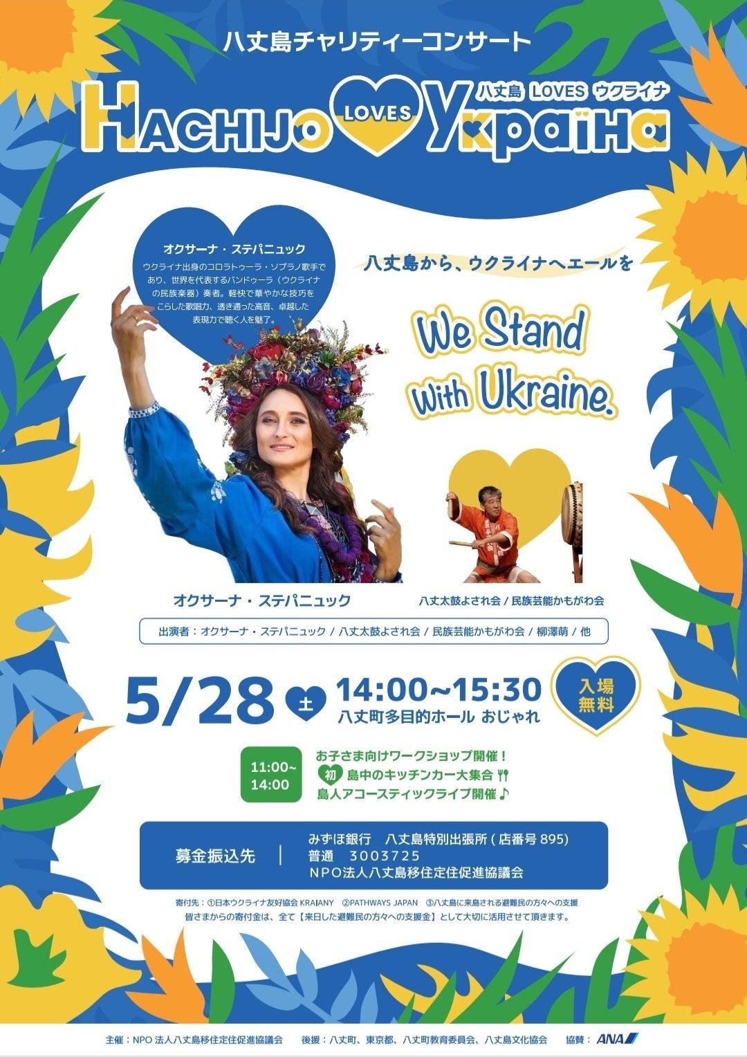 ウクライナにおける戦闘には、ウクライナの人々のみならず、世界中の多くの人々が心を痛めています。八丈島でもたくさんの方からウクライナを支援したい、そしてウクライナの文化、言葉、音楽に触れる機会が欲しいとのお声を頂戴しています。今回、駐日ウクライナ大使館と協働で、八丈島でウクライナ文化をご紹介すると同時に支援金を募るコンサートを開催する運びとなりました。ウクライナの人々は今まさに、皆様のお力を必要としています。ご協力よろしくお願いいたします。Слава Україні!