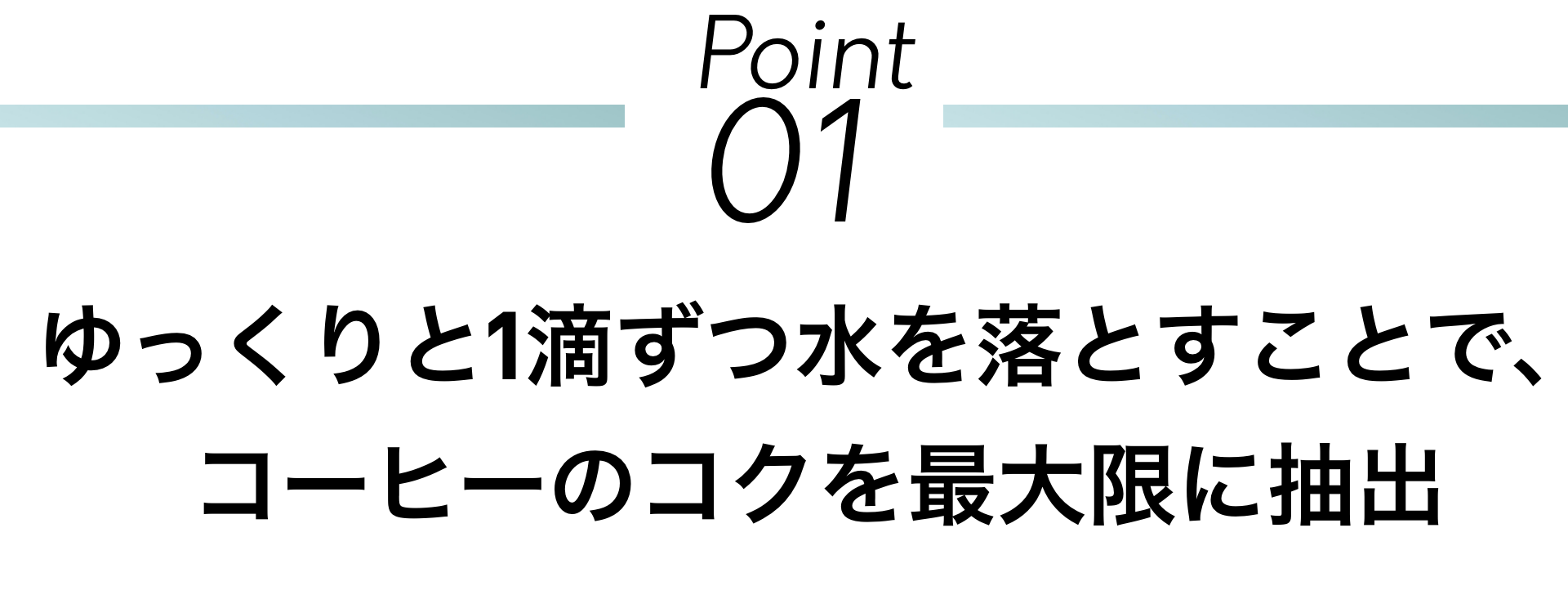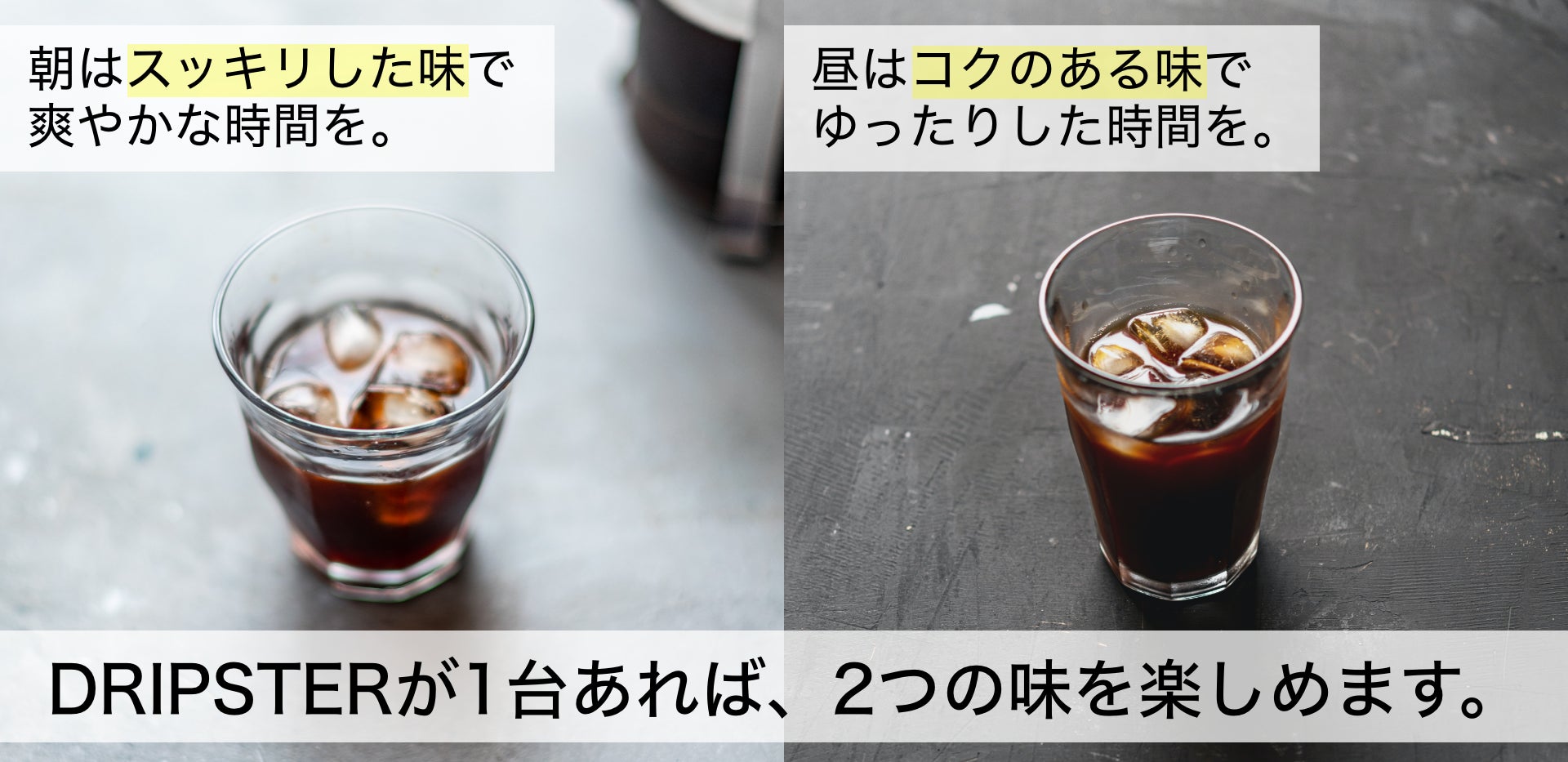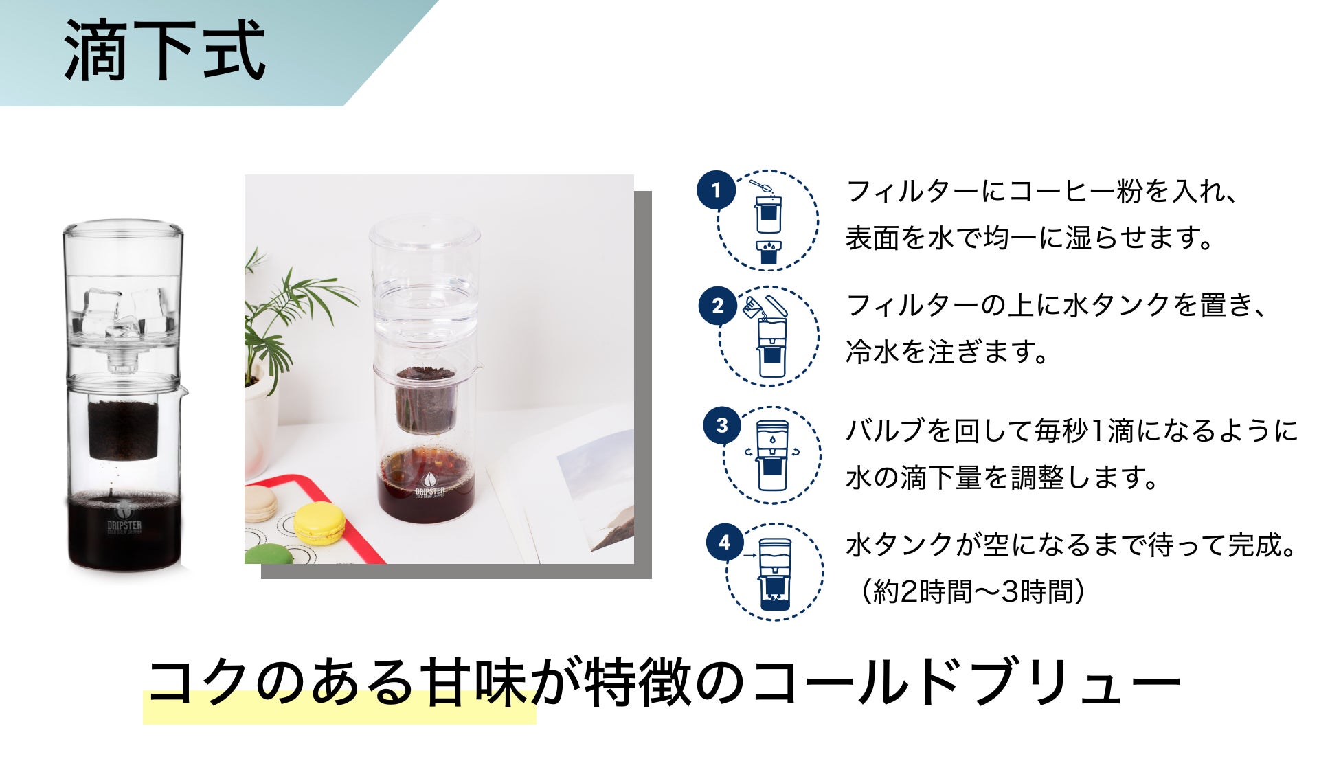 ※滴下式=ゆっくりと1滴ずつコーヒー粉に水を落とすことで、コーヒーの成分をじっくりと抽出する方式