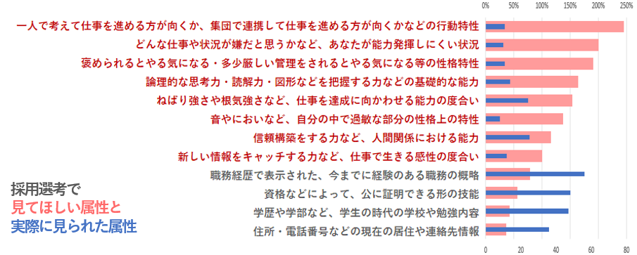 | 入社選考に当たって見てほしい度合いの上位は全て「ビジネスマインド(ベーススキル)」か「働き方の志向」(赤字で表示)であり、かつほとんど「見られていない」という印象(青線が「選考で見られた能力・属性・志向」を表す)を持っている |