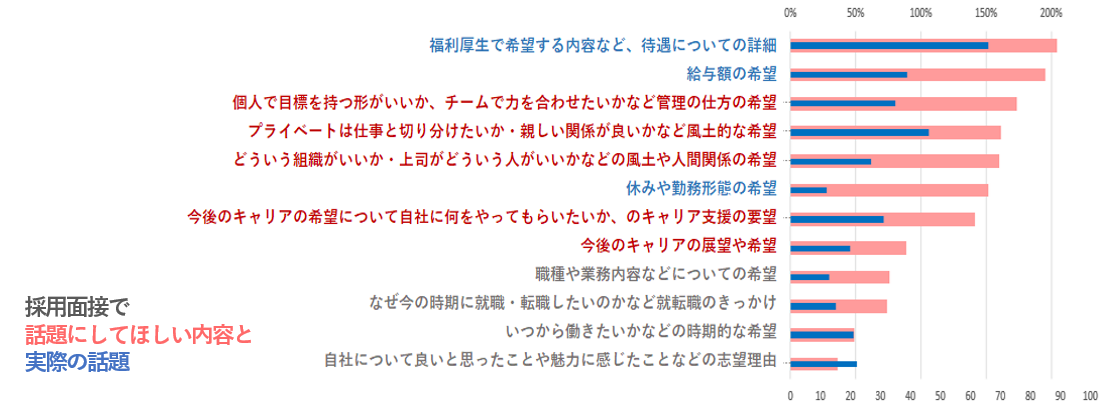 「賃金・待遇」の次に「働き方やキャリアへの志向」の項目が多くを占めていました。しかしながらこれらは実際には話題になっていないという結果となりました。こうした志向を把握して採用面接で活用することで、企業への志望度やエンゲージメントを大きく向上させられるものと考えられます。