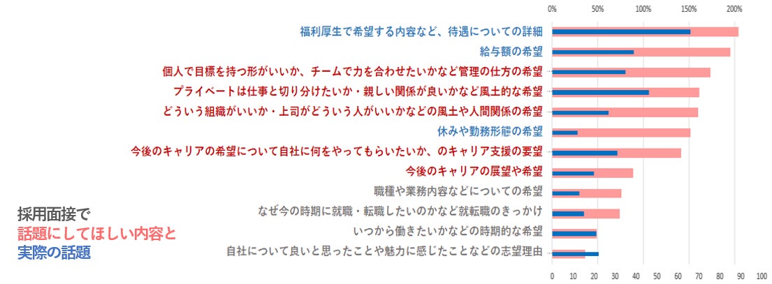 | 面接で話題にしてほしい度合いは、待遇(青字)の他は上位は全部が「働き方の志向(どのように働きたいか・どういう風土が良いか)」 |