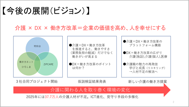 今回、 介護現場へのICT導入と『働きがい』との関係を実証する研究は広島初となります。 このプロジェクトでは、 働き方改革サポートにより「IT」と「人」の親和性を高めることで、 働き方改革の本質である『働きがい』に繋げ、 介護業界の課題である「業務効率」や「人手不足」を解決し、 全国へ発信していきたいと考えています。