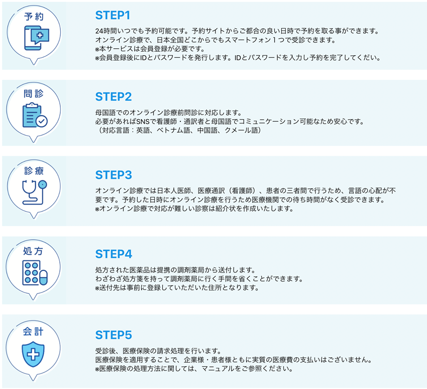 現在、日本には外国人労働者数が172万人と過去最高を更新したと厚生労働省より発表があり10年間以上も増え続けています。技能実習生や特定技能外国人を雇用されている企業側やこれら海外人材を監理されている監理組合も様々な支援策の取り組みを行っていますが、所属する海外人材の健康管理への支援策は負担が大きく、十分なサポートをするのが難しい事業者がほとんどです。例として、外国人が日本で病院を受診した際、一番問題になるのは言語や文化の違いです。簡単な日本語や母国語で説明をされても理解しづらい医学的説明を、文化背景の異なる医師に説明されても、不安は増し質問もできないまま診察を終えるのが現状です。担当する医師としても、異国の患者が本当に理解し納得できているかどうかは、判断出来ないことが多々あります。本サービスは一般診療をはじめ、メンタル診療や健康管理を技能実習生や特定技能外国人に提供するために、外国人診療を熟知している日本人医師と専門知識を持った通訳者と患者様の三者間をオンラインでつなぎ診察を行うサービス『TAKITO』を提供します。病院に行く時間が省け、付き添い不要で、母国語で医師に相談することができます。処方薬も自宅に届き、スマホ1つでどこからでも利用が可能です。