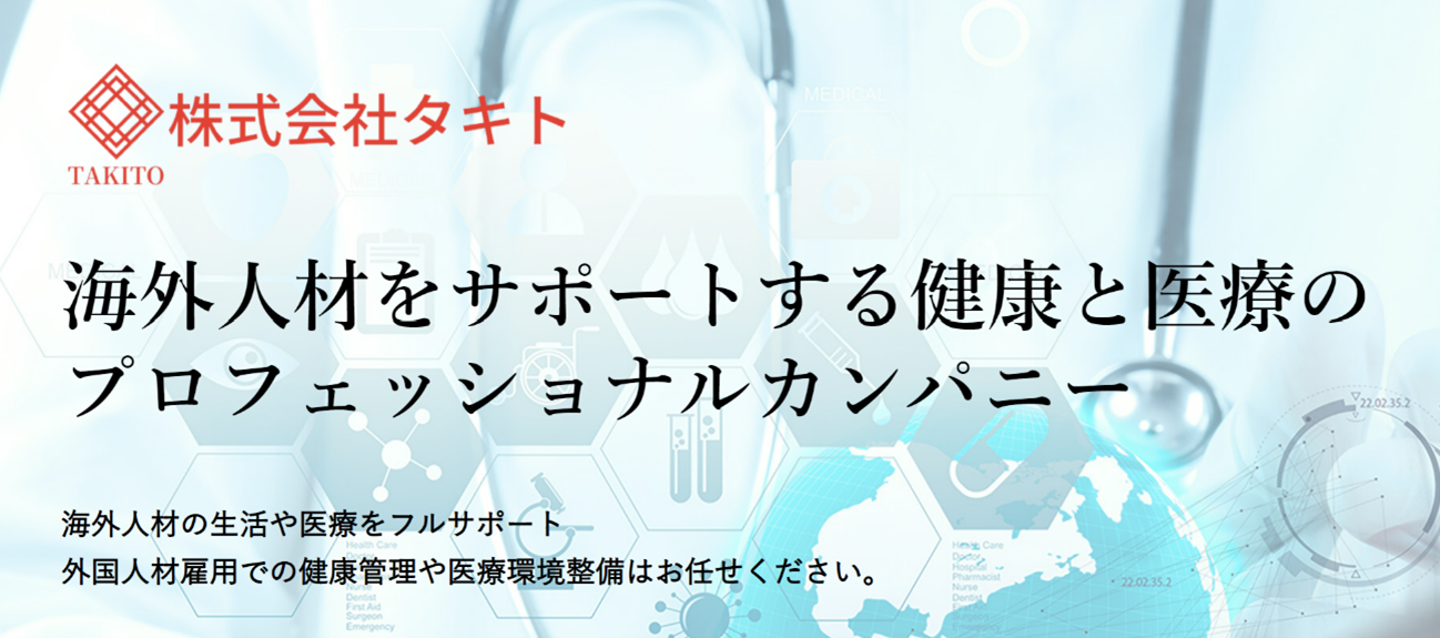 技能実習生や特定技能外国人が健康で働きやすい環境づくりを目指し、医療機関と連携して4ヵ国語対応の技能実習生・特定技能外国人向けオンライン診療のプラットフォームサービス『TAKITO』を株式会社タキト(大阪府大阪市北区中之島4丁目2番28号905号 代表取締役:伊藤章吾)が開始いたしました。