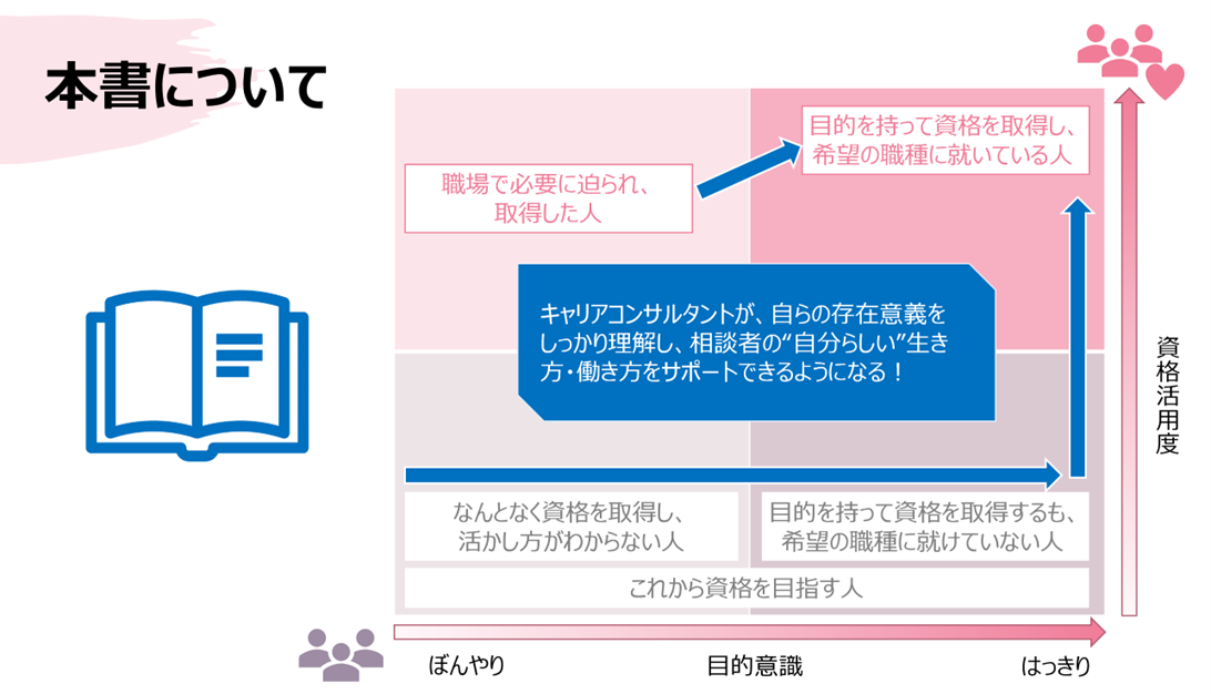 しかしながら、キャリアコンサルタントが活躍する領域は幅広く、その資格の活かし方はさまざまです。そのため、資格取得を目指す方の中には「資格を取れば仕事がある」と思っている方や、取得した方の中にも「どう活かせば良いのか?」と自身のキャリアに悩む方も少なくありません。本書は、そのようなお悩みを解決する一助を担うため、キャリアコンサルタントの皆さんが自分自身のキャリアをデザインする際に役立つ材料を提供しています。資格を取った先輩たちが、どのように資格を活かしているのか、資格を活かすために何をしたのか、インタビュー形式で生の声をお伝えしています。そして、活躍の場にはどのような分野があり、どうすれば目指す職域に近づけるのかについても「How to approach」という形で、その道筋について助言をしています。