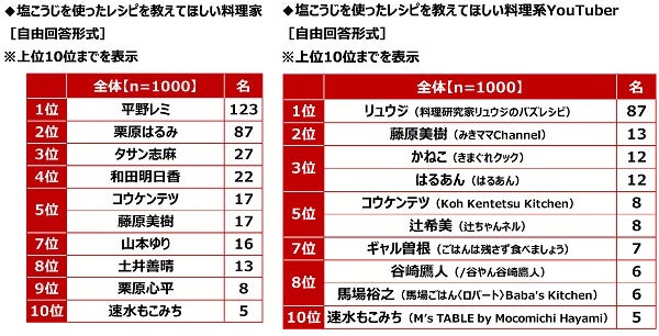 - 塩こうじを使ったレシピを教えてほしい料理家 1位「平野レミさん」2位「栗原はるみさん」 料理系YouTuberでは「リュウジさん」がダントツ