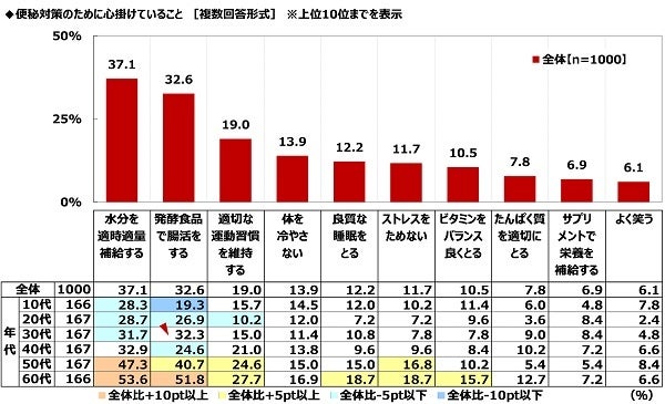 - 便秘対策のために心掛けていること TOP2は「水分を適時適量補給する」「発酵食品で腸活をする」 30代では「発酵食品で腸活をする」が1位