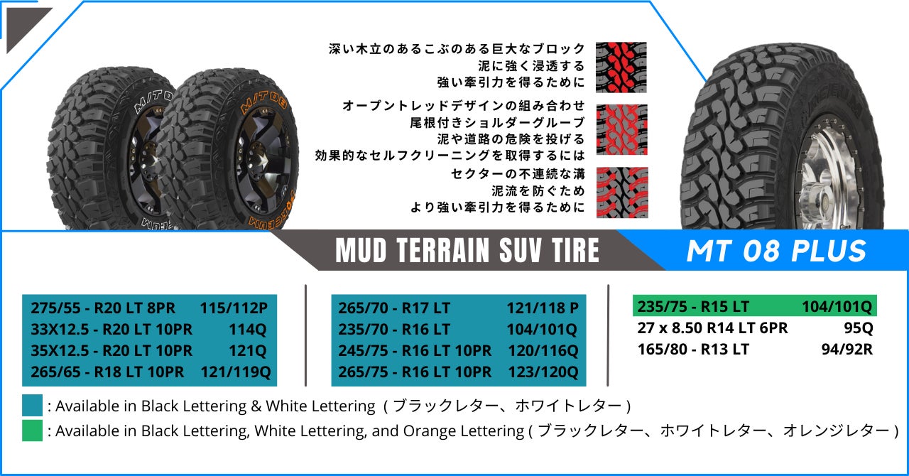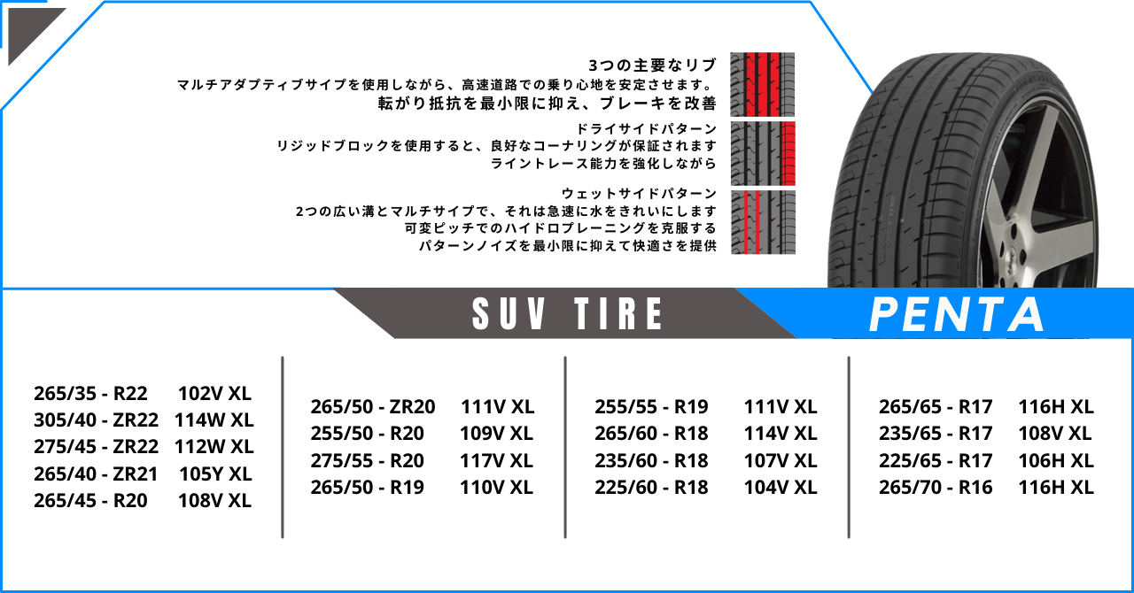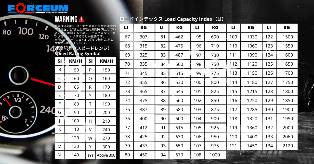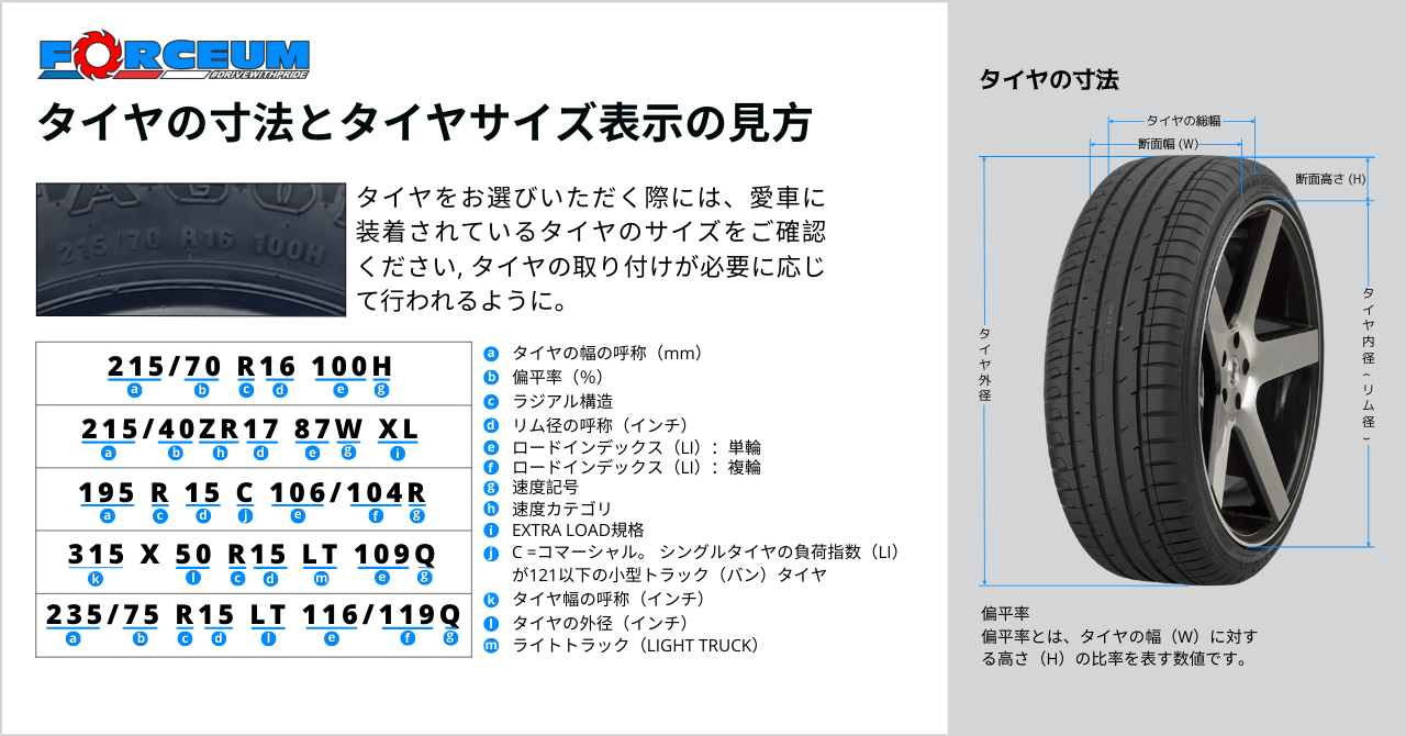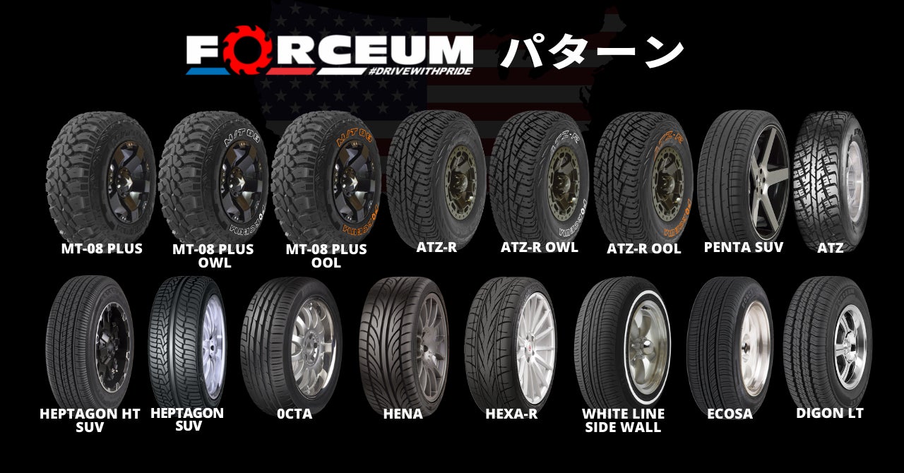 Forceumは、13インチから22インチまでのさまざまなパターンとサイズ、扁平率は30%から80%までの厚さのタイヤを提供しています。