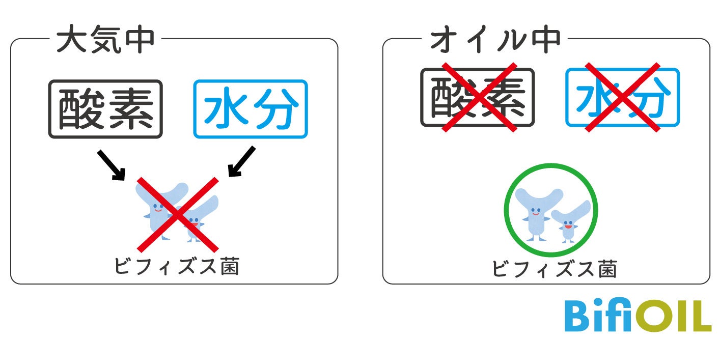 弊社ではオリーブオイルの水分と酸素から隔絶された環境を利用し、「ビフィズス菌配合オリーブオイル」を開発いたしました。開発にあたり、「ビフィズス菌が油に溶けない」という問題に直面し、食品添加物である「微粒二酸化ケイ素」を使用することでその問題点を解決いたしました。微粒二酸化ケイ素を少量添加することでオリーブオイルの流動性を保つことができ、ビフィズス菌が沈殿しにくくなりました。また、微粒二酸化ケイ素は無毒性であるため、安全性が高く、人体に影響を与えません。