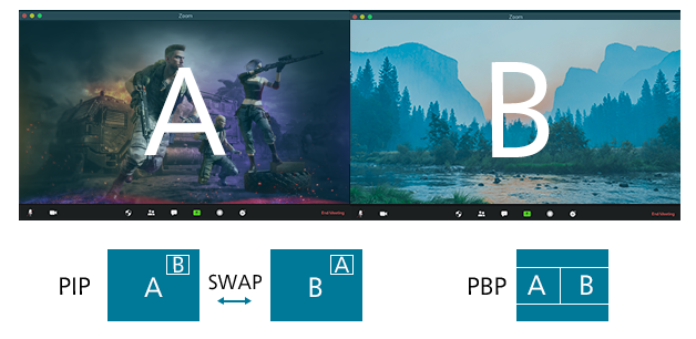 画面を左右に分割して映すPBP(ピクチャー・バイ・ピクチャー)と、画面内に小窓を設け映すPIP(ピクチャー・イン・ピクチャー)の2種類に対応しています。