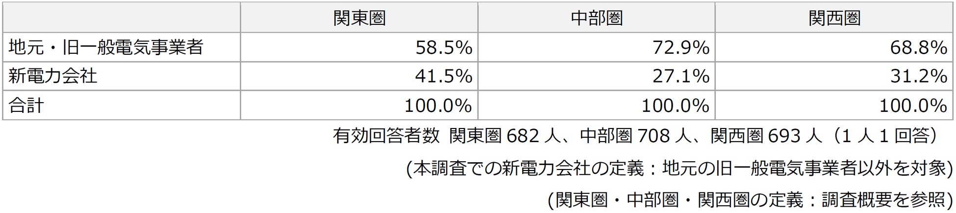 家庭領域における新電力会社との契約数比率は、関東圏で41.5%、中部圏で27.1%、関西圏で31.2%の結果となった。特に関東圏での新電力比率が突出している。