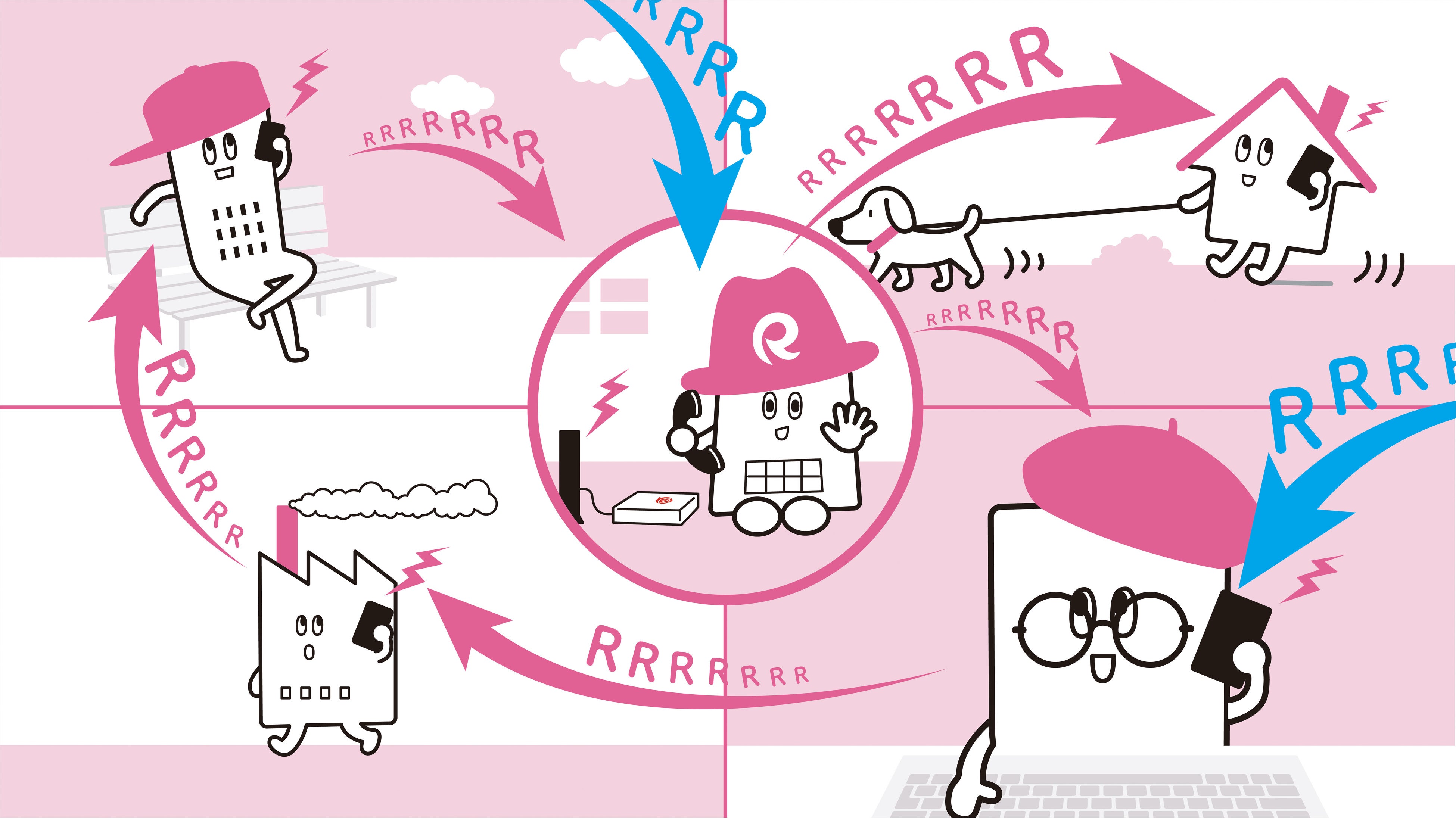 新ラジオ・TVCMでは、事務所(ジムション)、工場(ファクトリン)、オフィス(オフィスン)、家(イエウォン)、ビル(ビルヂン)など建物を擬人化したキャラクターが街に飛び出し、固定電話の受信発信をスマートフォンで出来る自由な世界を表現しています。