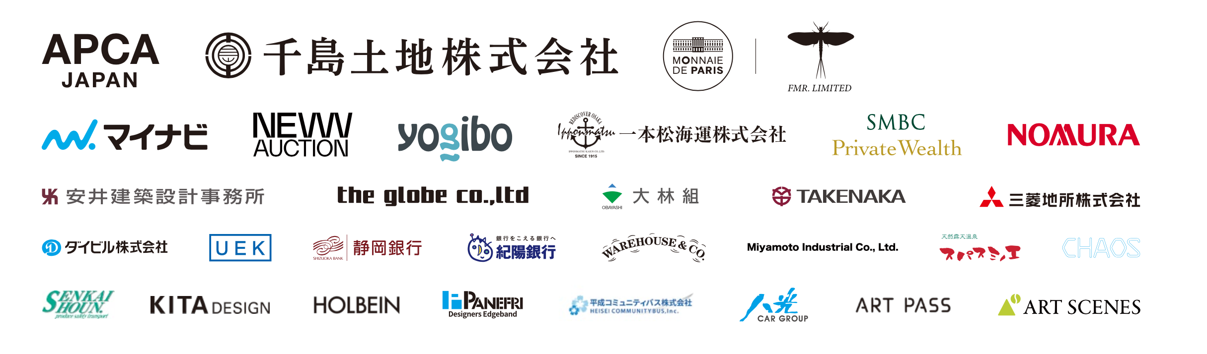 協賛:パリ造幣局|FMR. LTD、株式会社マイナビ、株式会社 New Auction、Yogibo、一本松海運株式会社、SMBCプライベートウェルス、野村證券株式会社、 株式会社安井建築設計事務所、有限会社 ザ・グローブ、株式会社大林組、株式会社竹中工務店、三菱地所株式会社、ダイビル株式会社、UEK株式会社、 株式会社静岡銀行、株式会社紀陽銀行、株式会社ウェアハウス、株式会社宮本工業所、スパ スミノエ、株式会社ケイオス、泉海商運株式会社、KITA DESIGN、 ホルベイン画材株式会社、パネフリ工業株式会社、平成コミュニティバス株式会社、八光エルアール株式会社(八光カーグループ)、ART PASS、Art Scenes(株式会社TODOROKI)、サントリーホールディングス株式会社、医療法人芳歯会 上橋歯科医院、ART OFFICE OZASA inc.、株式会社サカエ商会、 谷間総合会計事務所、株式会社ヴェスティル、FIGO、株式会社ozawa