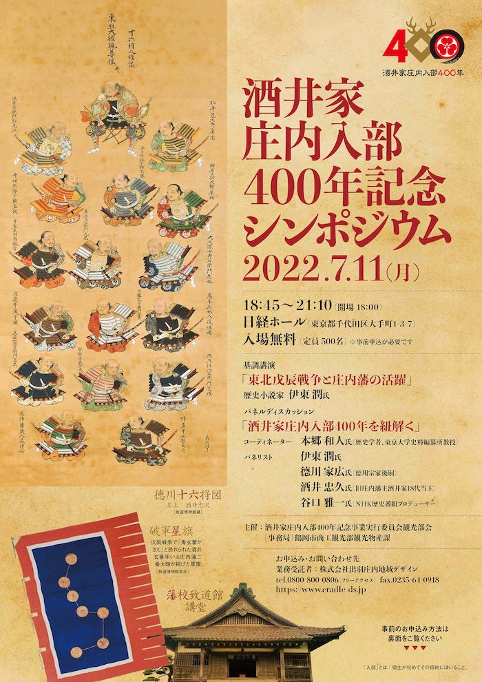 徳川四天王筆頭・酒井忠次を祖とする酒井家3代忠勝が元和8(1622)年、山形県の庄内(現在の庄内地方)に入部以来、今年で400年を迎えます。酒井家庄内入部400年記念事業実行委員会観光部会(山形県鶴岡市、部会長 石原純一)では、「庄内藩」の存在と今も酒井家の殿様が暮らす地である「山形県庄内地方」をより多くの方に知っていただくため、下記のとおりシンポジウムを開催いたします。同イベントには、 人気歴史小説家の伊東潤氏、歴史番組でご活躍の本郷和人氏、德川宗家後嗣、酒井家当主、NHK歴史番組プロデューサーをお招きし、酒井家庄内入部400年を紐解きます。入場は無料ですが、事前申し込みが必要です。
