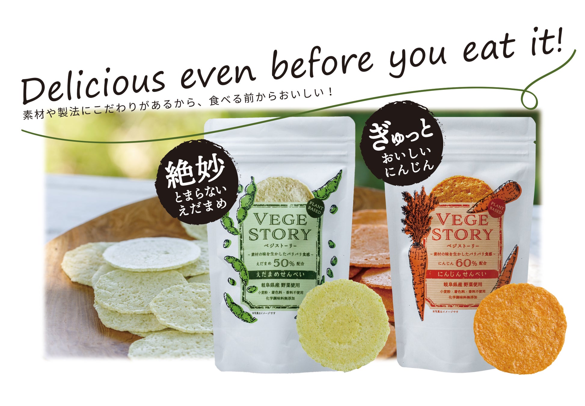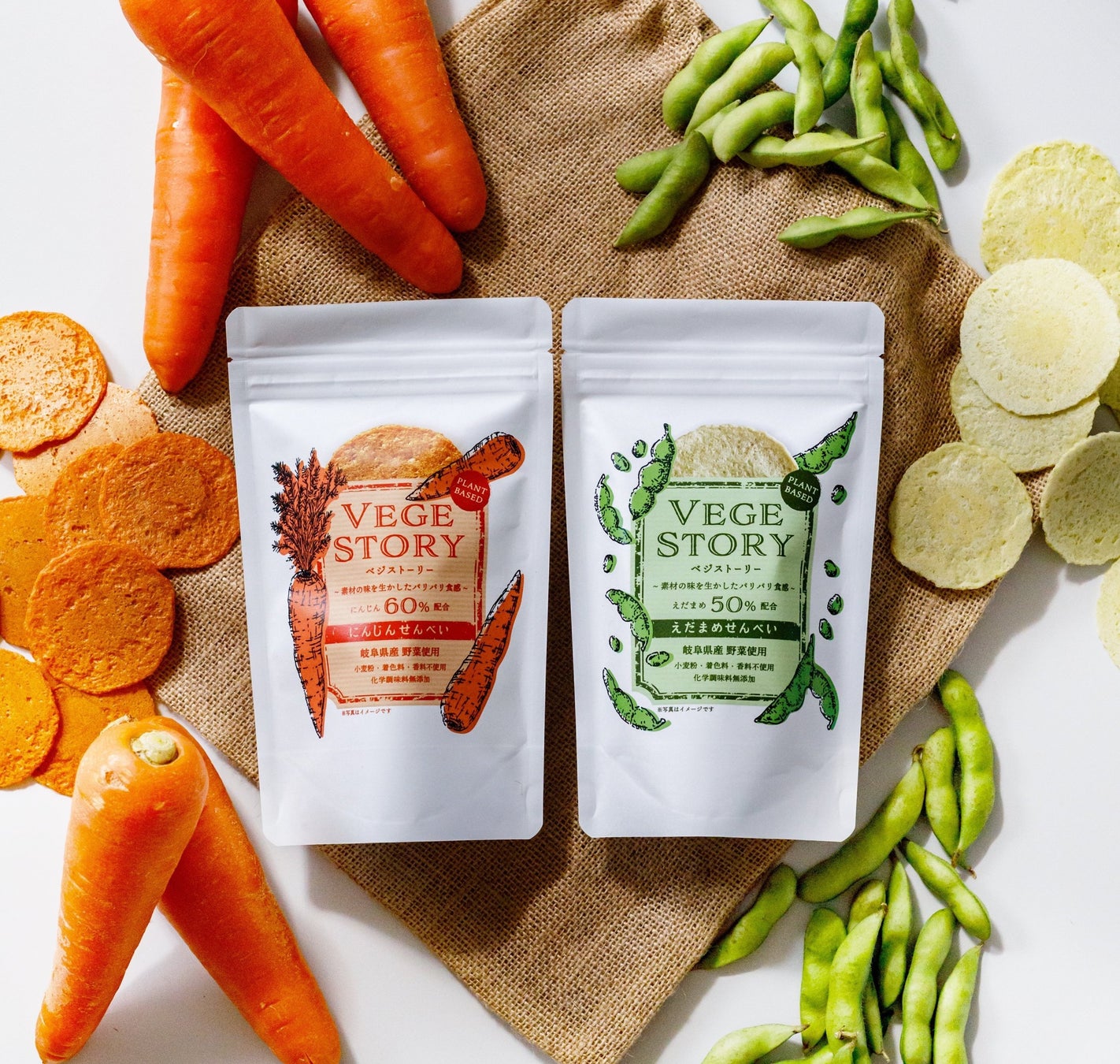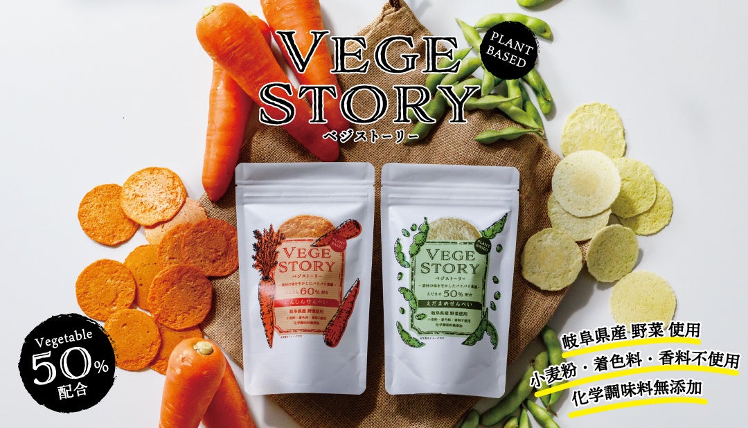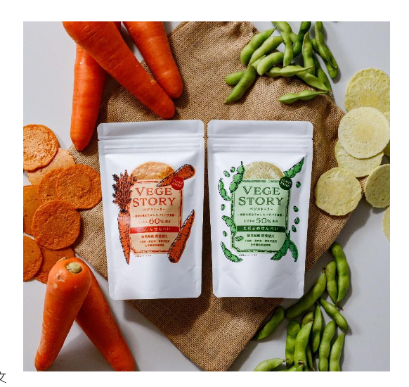 【捨てるを美味しく】野菜(規格外)を50%以上贅沢に使用した美味しさ&サステナブルなおせんべい『VEGESTORY (ベジストーリー えだまめ・にんじん)』 を発売(8/1~)