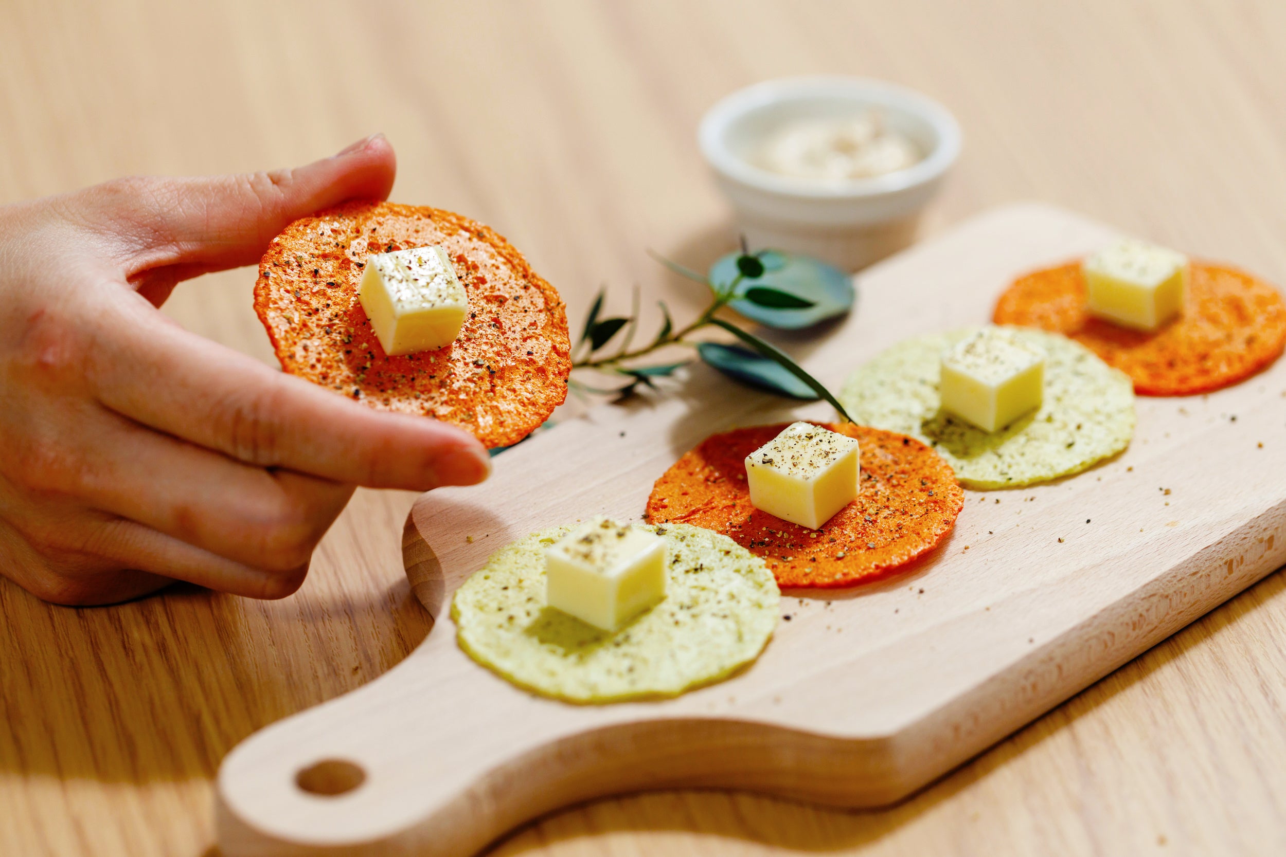 おせんべいの上にチーズやディップなどトッピングしてアレンジするのもおすすめです。