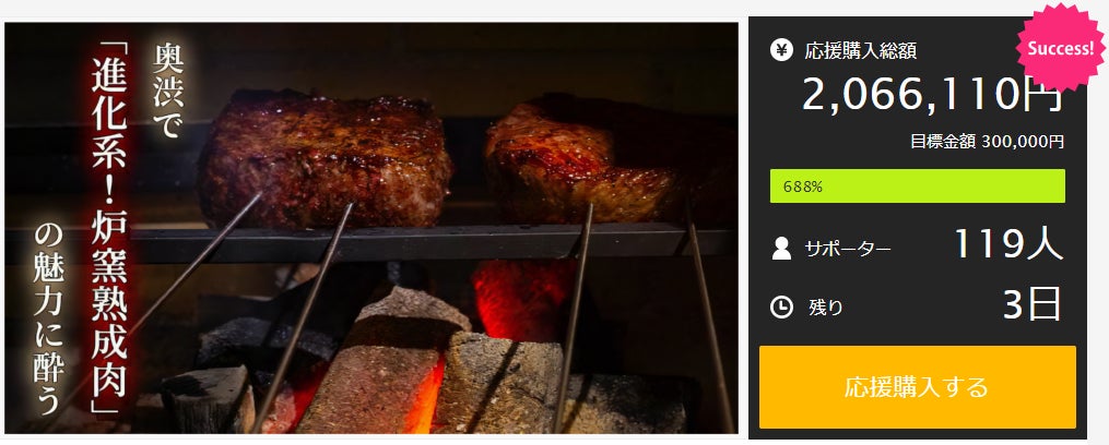 今回は2度目のプロジェクト公開で、最先端の熟成機「DENBA」により1回目よりも肉を”進化”させたお食事とご自宅で召し上がっていただけるリターン品をご用意。プロジェクト公開後初日で目標金額を達成し、現在達成率は688%と順調に引きあがり、終了まで残り3日です。