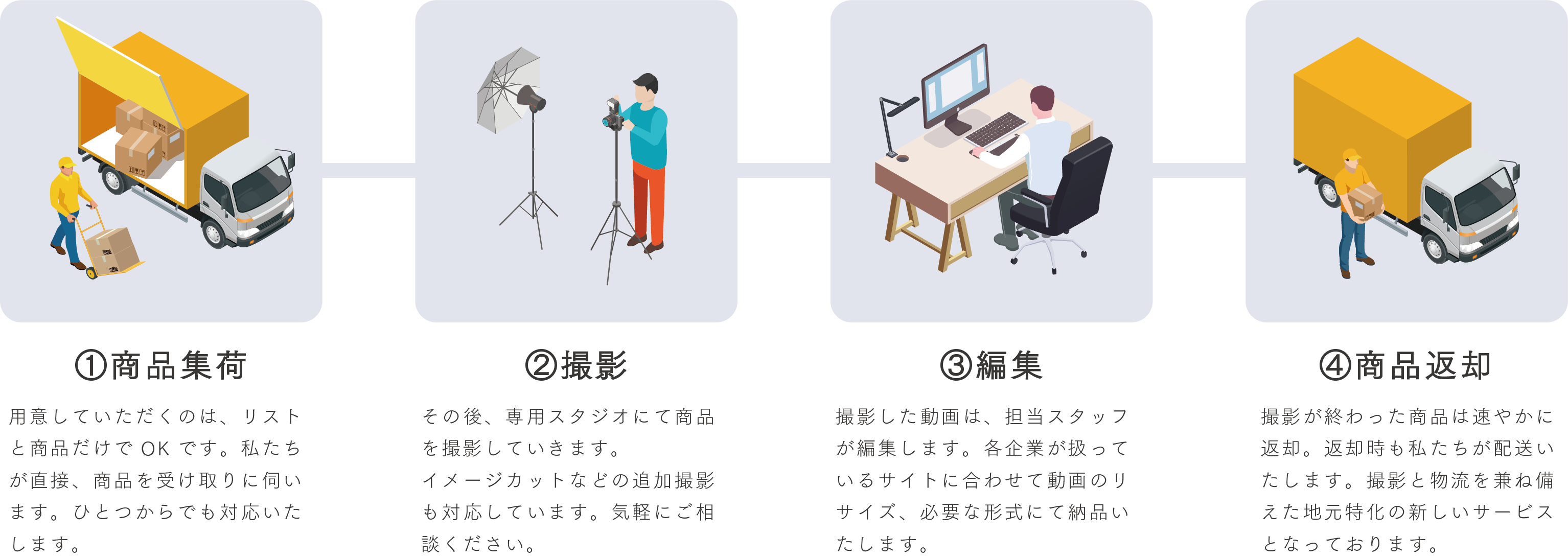 受注後決済→ヒアリング→商品とリスト用意→集荷→商品棚に保管→撮影→データ納品→返却配送