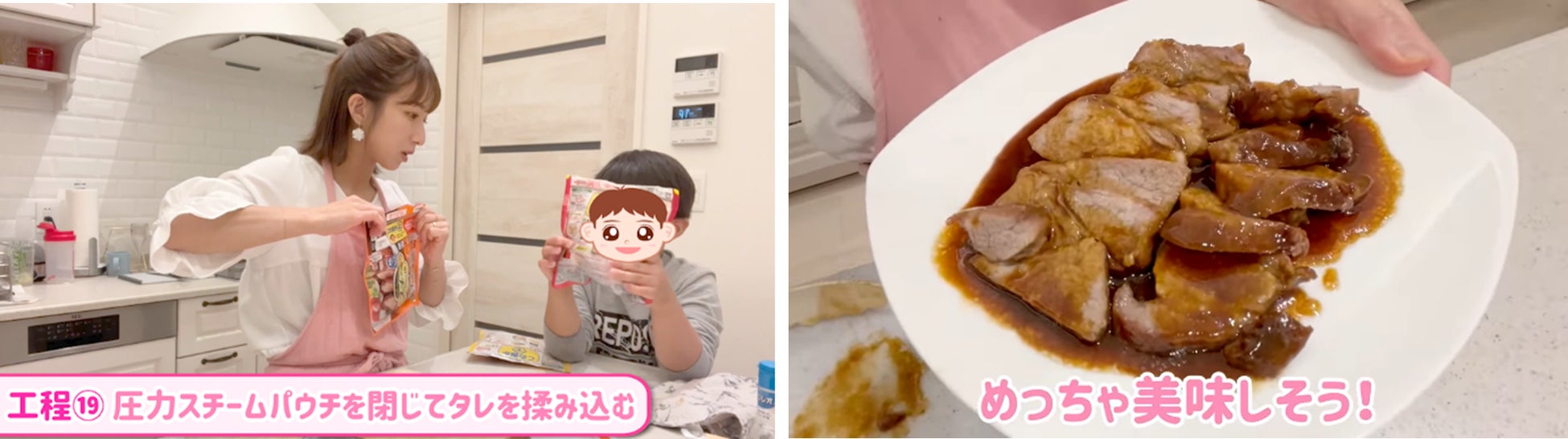 味の素株式会社(社長:藤江 太郎 本社:東京都中央区)は、ママタレントとして活躍する辻希美さんのYouTubeチャンネル「辻ちゃんネル」とタイアップし、電子レンジを使って簡単に短時間で調理できる、圧力スチーム調理パウチ入り合わせ調味料「スチーミー®」<豚チャーシュー用><鶏チャーシュー用><スペアリブ用>の3種を使用した、簡単・時短で本格的な夕食メニューを披露した動画を、5月20日(金)19:00より公開しました。