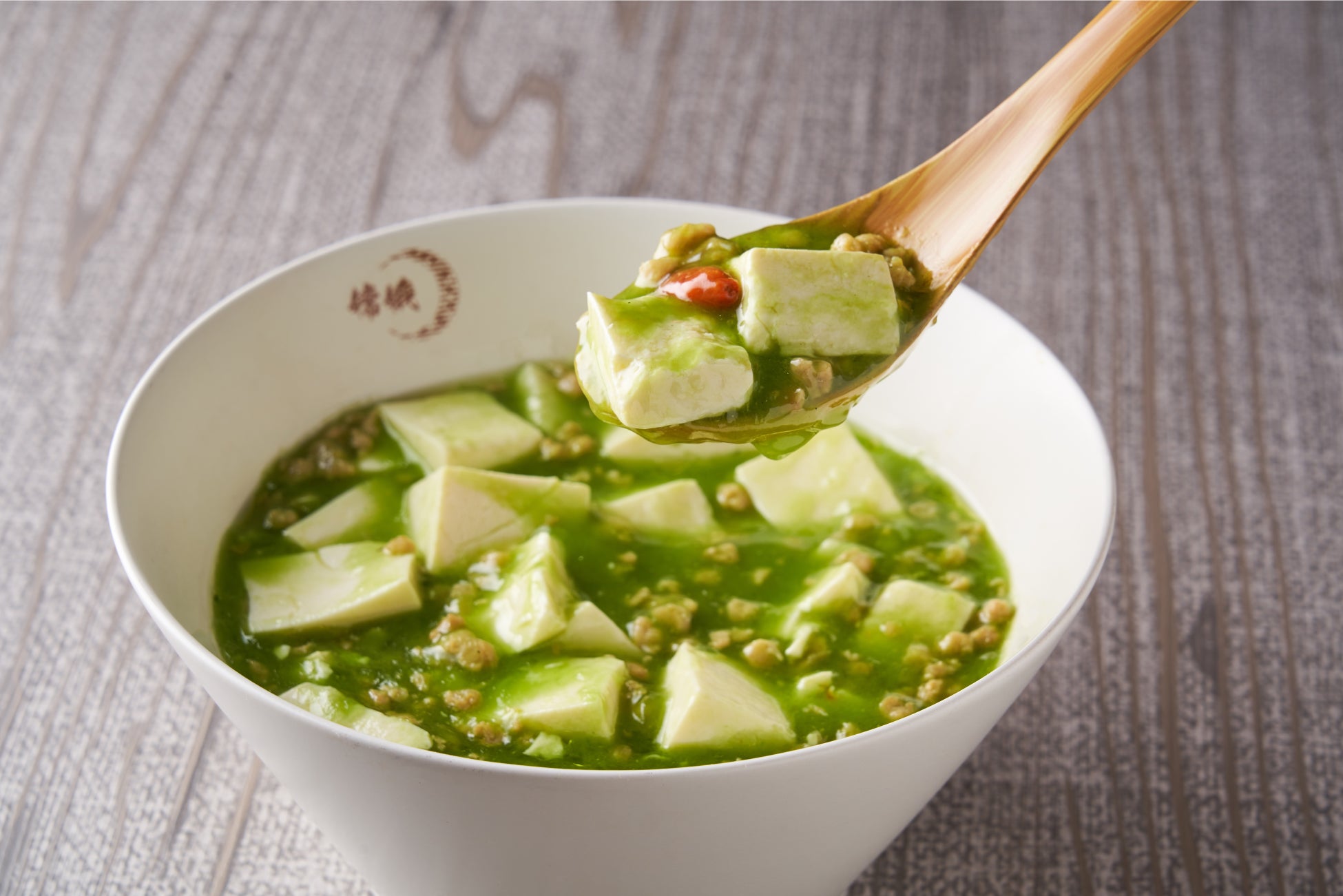 当店人気No.1!ほどよい山椒の香りで仕立てた特製の麻婆豆腐。鮮やかなグリーンは季節の緑野菜100%のピューレを使用しており優しい味にリピート続出!