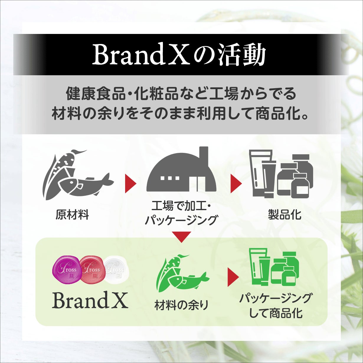 『Brand X』は、「余剰原材料×ビューティー×ヘルスケア」をコンセプトに、この度活動を開始いたします。既製品と品質は変わらないのに捨てられてしまう食品や化粧品の原材料を買い取りまたは譲り受け、次々にアップサイクル(再度製品として生まれ変わらせる)することで、材料を無駄にせず、環境保全や、食品・化粧品業界の継続や発展を目指していきます。