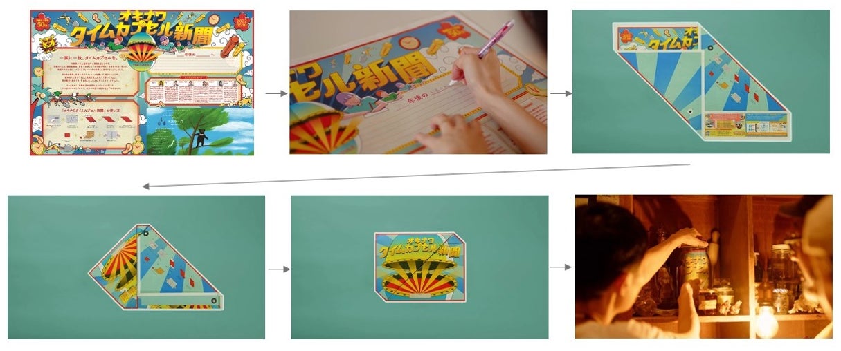 ムービーでは、突如未来から現れた新聞配達員が沖縄中を走り回り、様々な人の家に『オキナワタイムカプセル新聞』を投函していきます。新聞に気づいた人が家族や友人、時には一人で未来へのメッセージを新聞に記入していき、思い思いの場所へタイムカプセルを保管します。ある人は棚に飾り、ある人は土に埋め、中にはシーサーの口にまで入れてしまう人もいます。子供からお年寄りまで、年代を問わず沖縄中の人々がメッセージを書く様子を見守った配達員は、最後にカメラマンに新聞を渡して颯爽と未来へ帰っていきます。ムービーの終わりには、今回の企画に賛同していただいた沖縄出身の著名人の方々からのメッセージも公開しています。明るくて元気な沖縄の未来に向けて、このコンセプトムービーを見た多くの人が『オキナワタイムカプセル新聞』でメッセージを残すことを願っています。