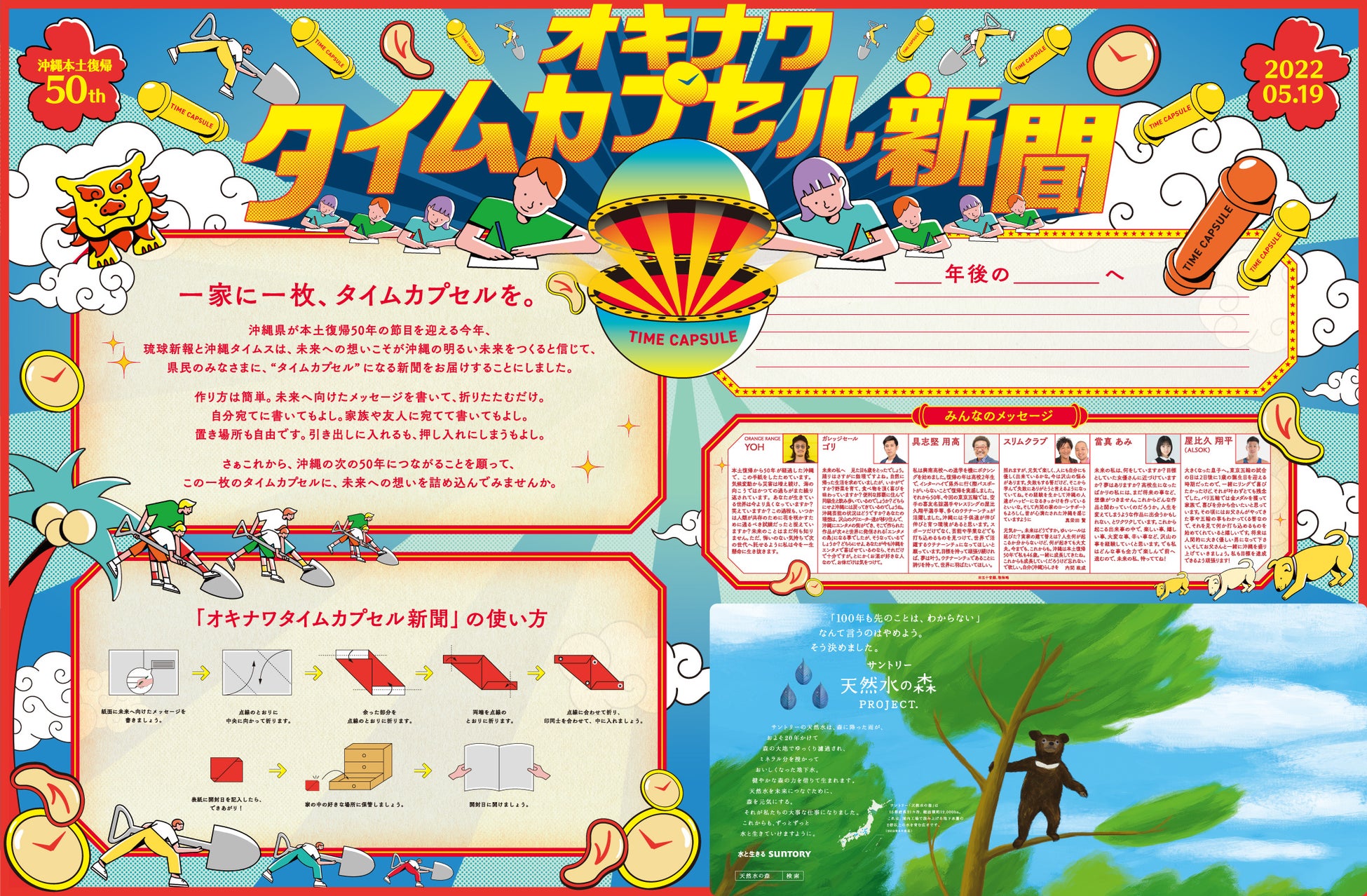 『オキナワタイムカプセル新聞』は、 30年ぶりに沖縄市で開催される第70回全日本広告連盟 沖縄大会の記念企画で、メッセージを書き込み折りたたむことで長い間保存できるタイムカプセルになる新聞広告です。沖縄県が本土復帰50年の節目を迎えるこのタイミングだからこそ、県民・読者の皆様に未来を考えるきっかけにしていただきたいという想いを込めて、タイムカプセルになる新聞広告と、本企画のコンセプトムービー・WEBサイトを制作しました。また、沖縄出身の具志堅用高さん、ORANGE RANGE YOHさん、スリムクラブ 真栄田賢さん、スリムクラブ 内間政成さんなど総勢7名の著名人にも本企画に賛同いただき、『オキナワタイムカプセル新聞』に参加頂いております。