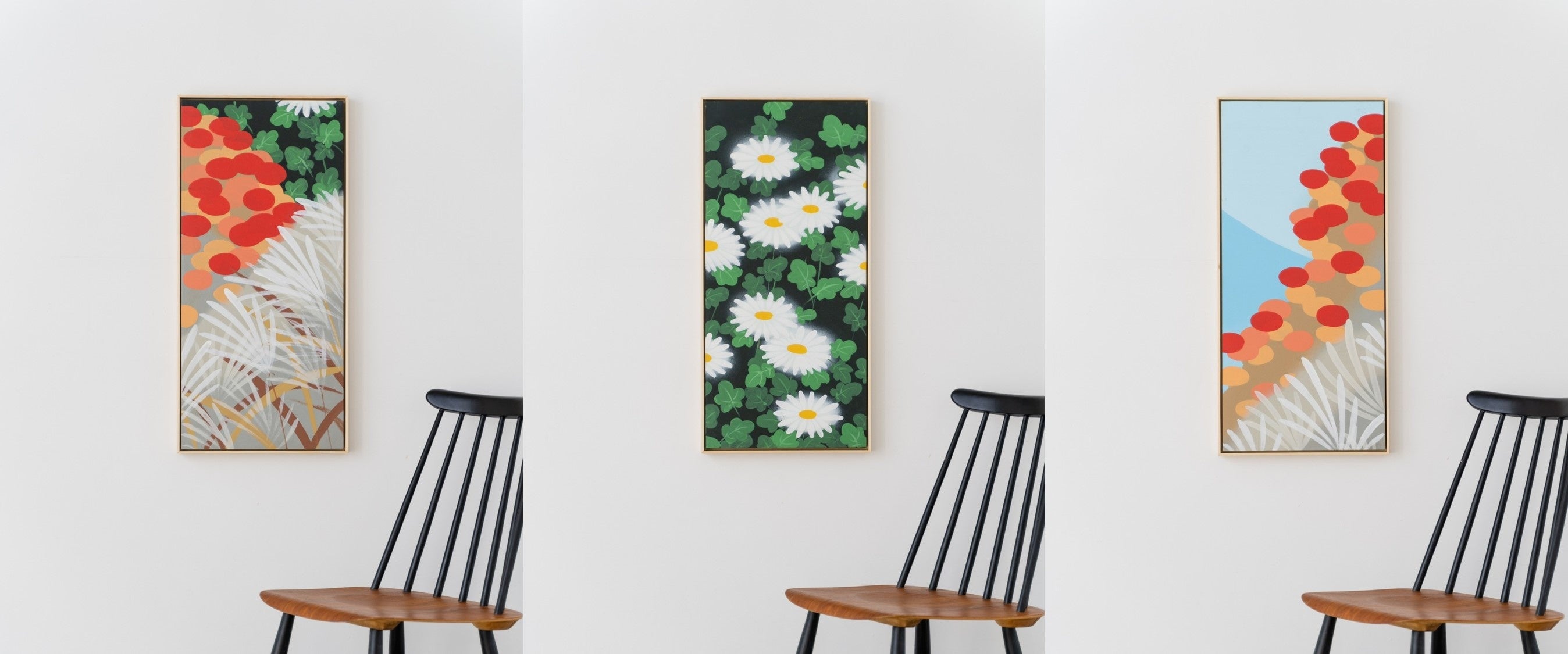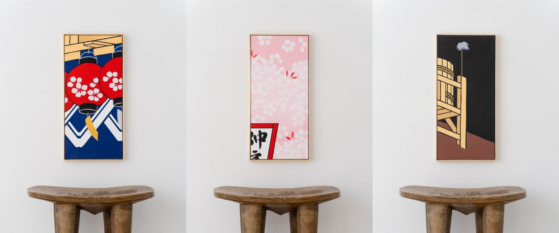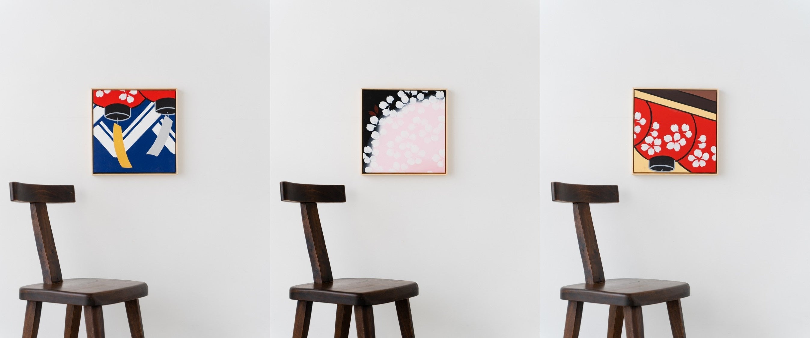 劇場の背景をモチーフにした作品です。実際に国立劇場の舞台で使用された背景画をモチーフに、本物の絵師が等身大で製作したアートピースです。1枚1枚見ても全体図が想像できない、だからこそ、大道具における背景画の大きさを感じて欲しいという思いを込めて作りました。それぞれの題材の特徴的な色や形を切り取った先に感じる思いを大切にしてください。