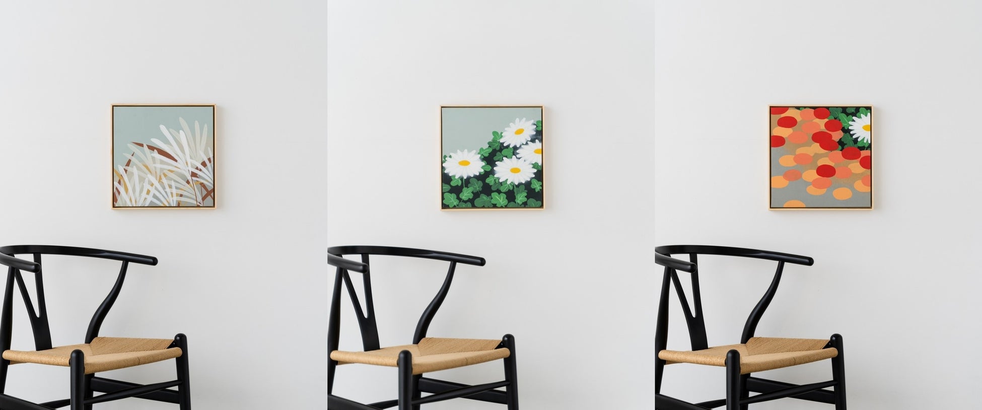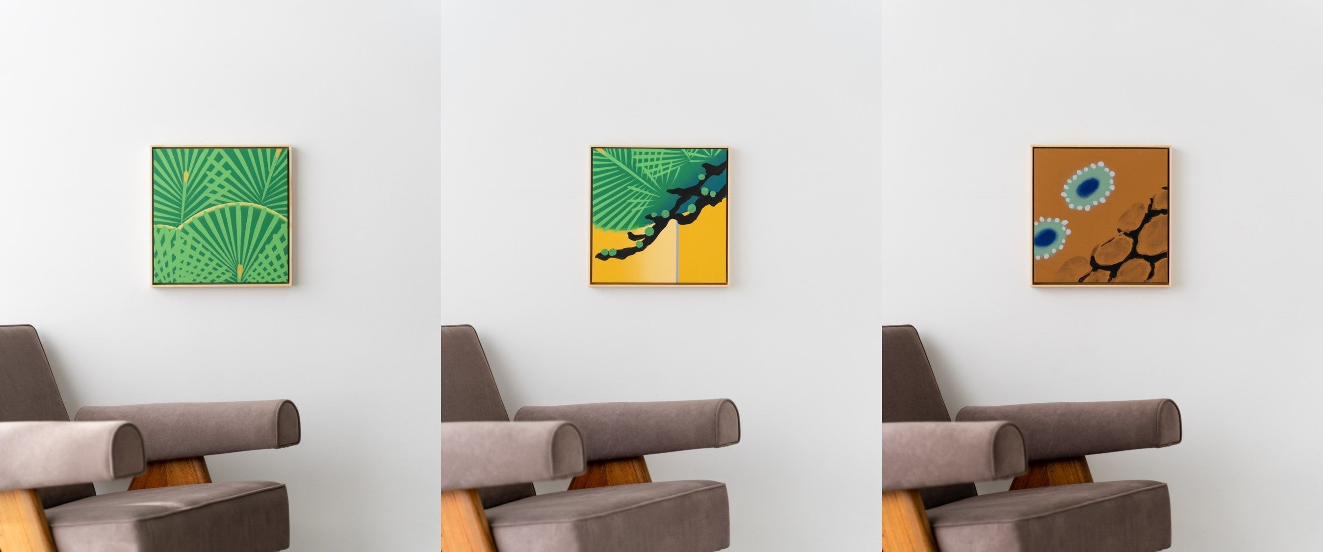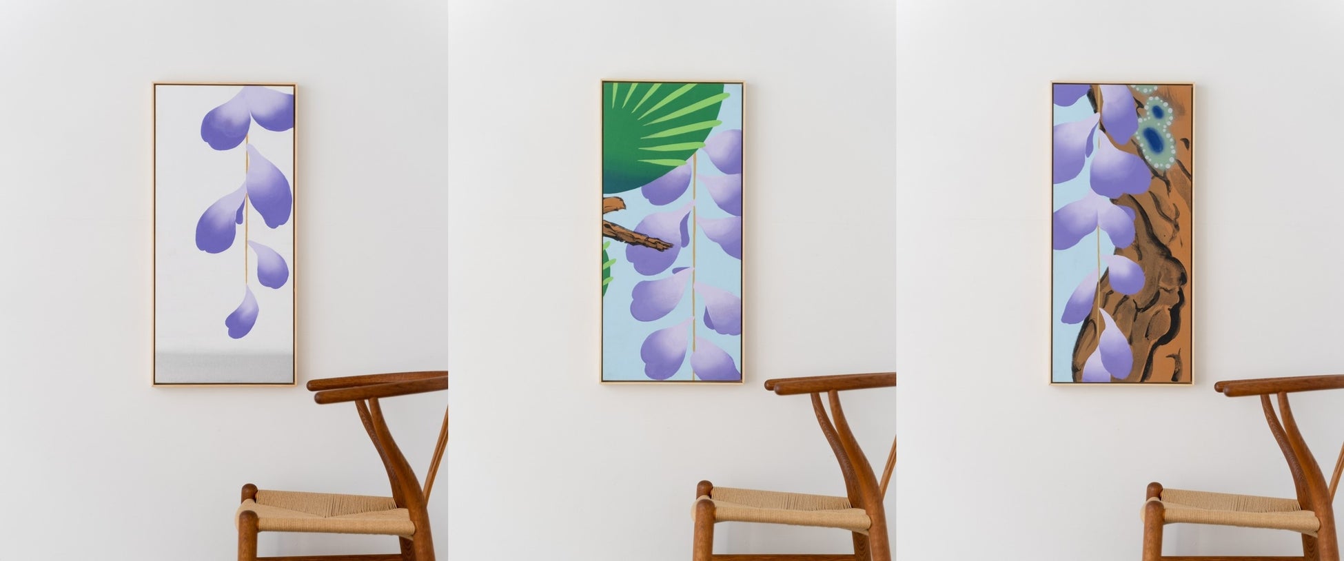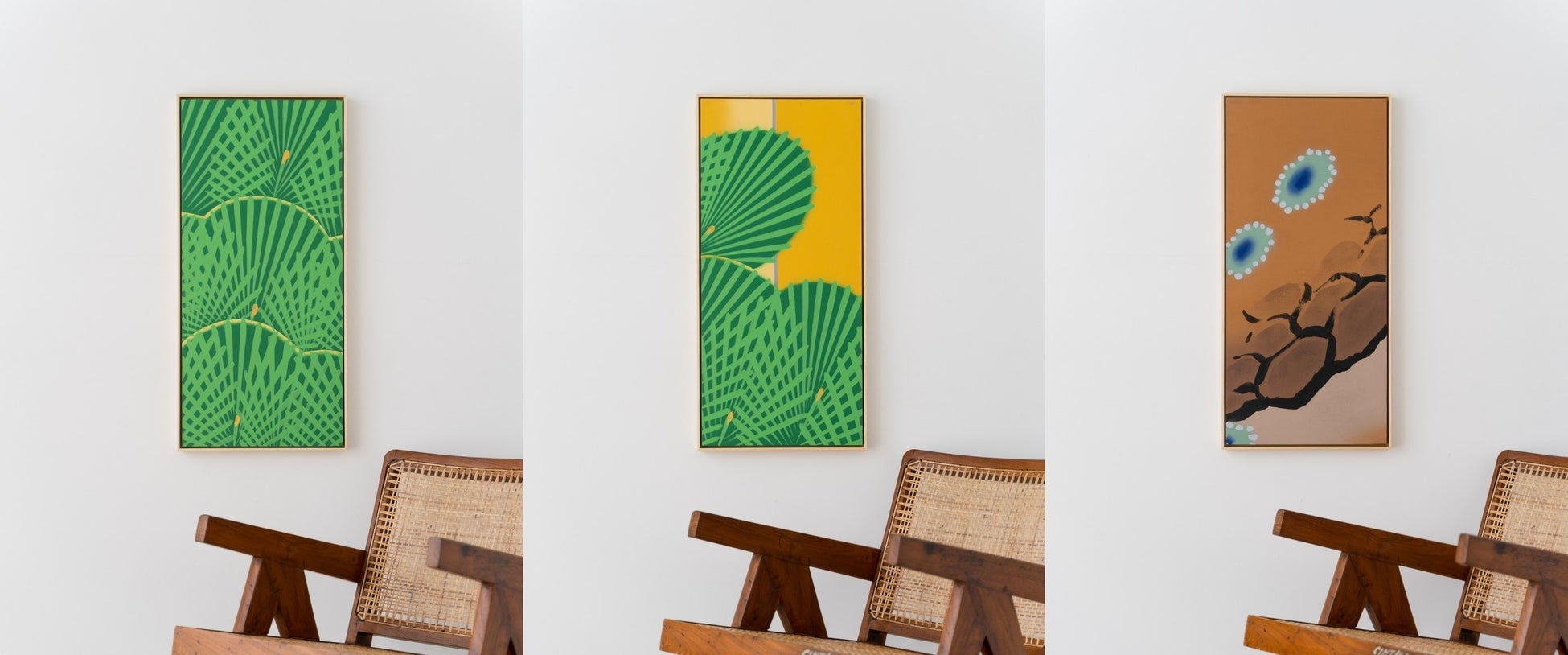 劇場の背景をモチーフにした作品です。実際に国立劇場の舞台で使用された背景画をモチーフに、本物の絵師が等身大で製作したアートピースです。1枚1枚見ても全体図が想像できない、だからこそ、大道具における背景画の大きさを感じて欲しいという思いを込めて作りました。それぞれの題材の特徴的な色や形を切り取った先に感じる思いを大切にしてください。