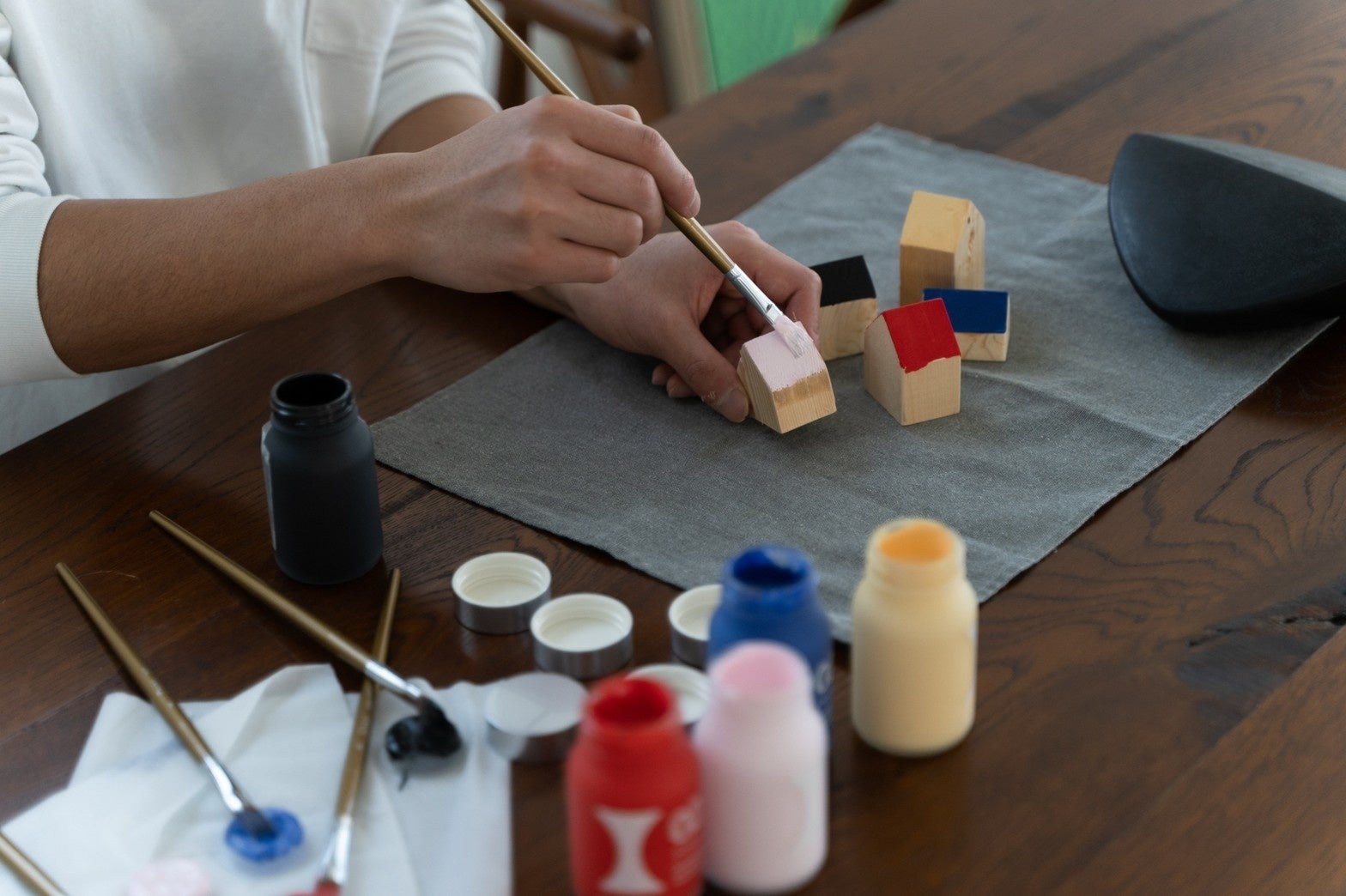 独自調色したインテリア用水性塗料5色と、それを塗って楽しめる木製オブジェのセット。