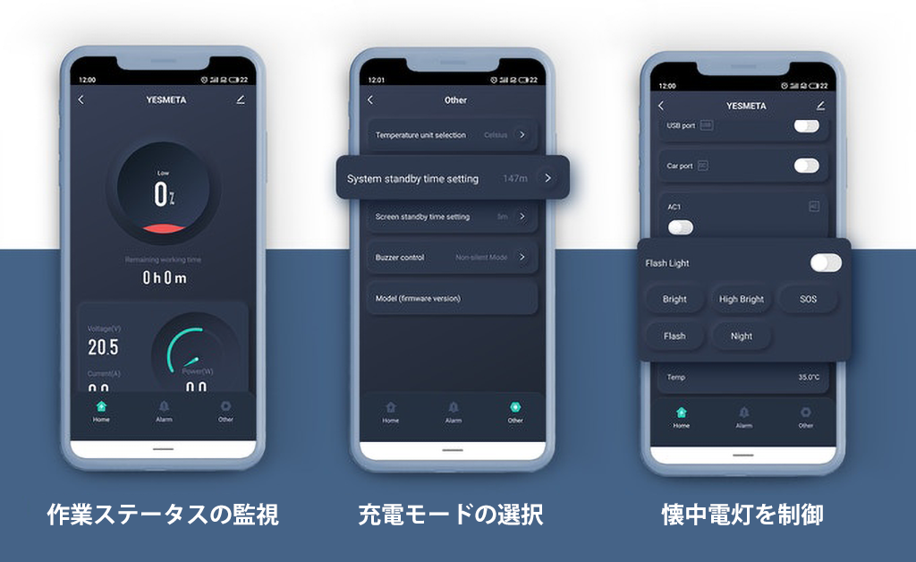 作業ステータスの監視、充電モードの選択、ライトを制御など、携帯との接続とアプリでの制御が可能です。
