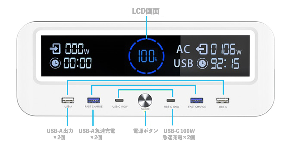 7つの出力モードと、最大12台のデバイスに電源供給が可能です。最大2200Wの出力に対応しており、出力の高い家電の利用も可能です。