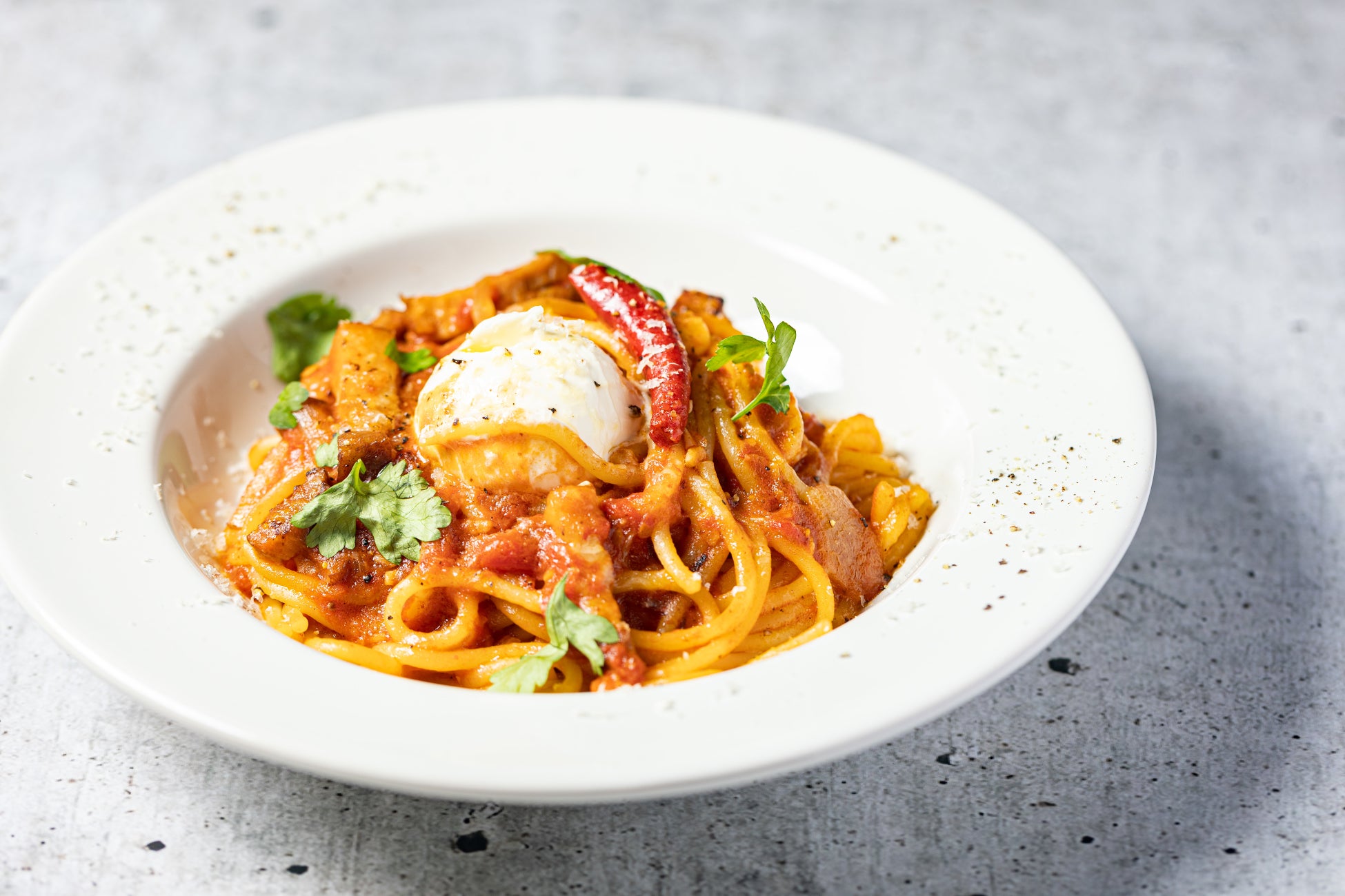 そして、自慢はなんといっても、もちもちの生麵を使ったパスタ。アマトリチャーナやボロネーゼなど、シンプルさを貫いたメニューですが、アマトリチャーナはサワークリームをのせて、絡めながら最後はトマトクリームソースのようになる味の変化を楽しめるような、ちょっとした仕掛けをご用意。ボロネーゼは、じっくりと煮詰めたフォン・ド・ヴォーで仕上げ、和牛の旨味をよりダイレクトに感じていただけます。