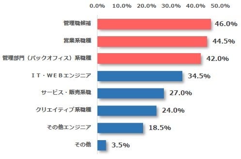 職種別では「営業系職種(44.5%)」、「管理部門系職種(42.0%)」、「IT・WEBエンジニア(34.5%)」と続きました。