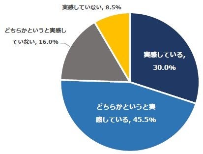 最後に、リファレンスチェック導入企業の人事担当者200名を対象に、リファレンスチェックの実施により、採用におけるミスマッチ減少を実感できたか質問したところ、75.5%が「実感している」(実感している:30.0%、どちらかというと実感している:45.5%)と回答しました。