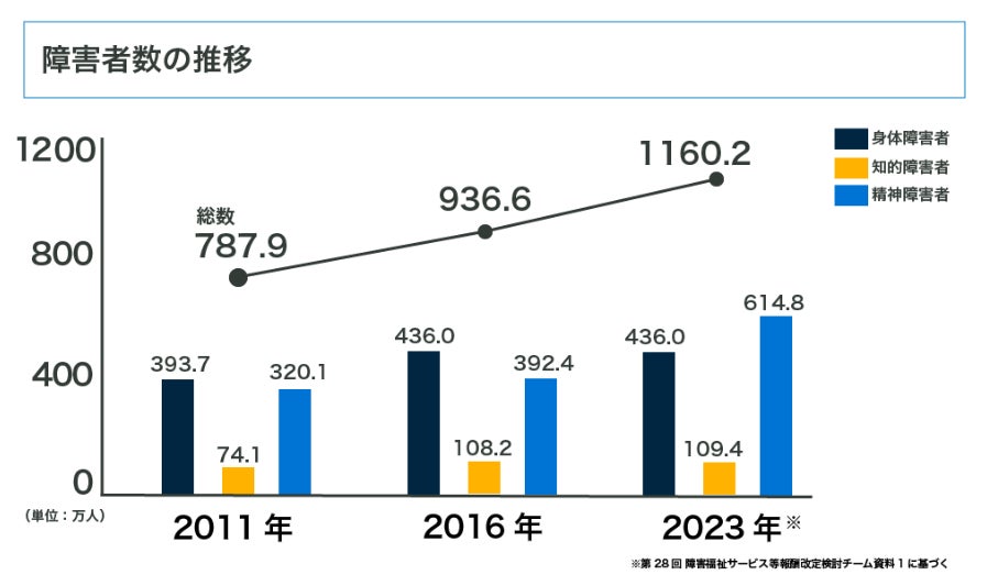 近年、障がいを持つ方の数が増加しています。2022年時点での日本における障がい者・障がい児の総数は1,164万人以上にのぼり、2016年からの5年間で24%以上増加しています**。