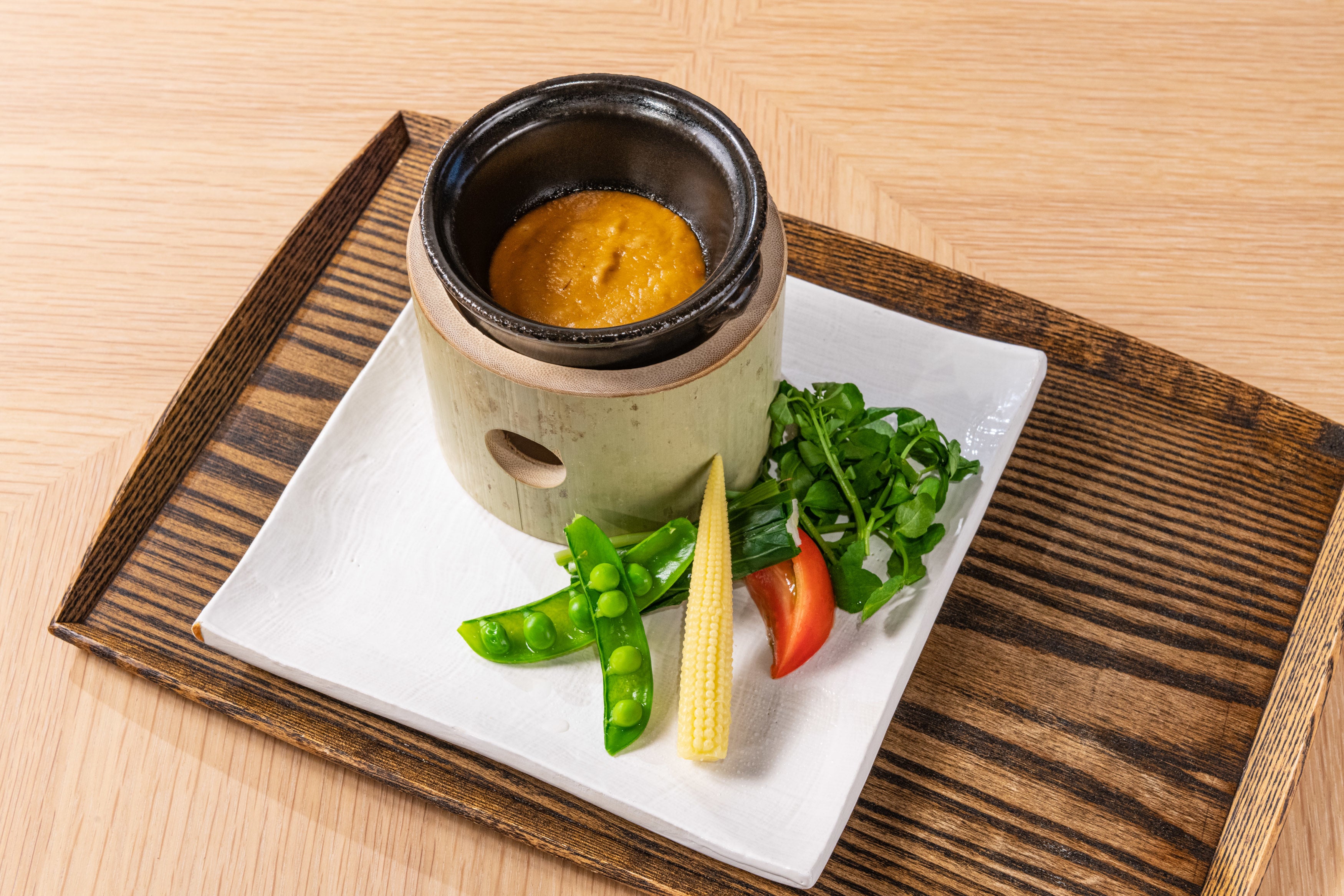 茄子味噌に、アンチョビの代わりとして日田のうるかを加えたコクのあるソースで野菜をいただく、和製バーニャカウダです。5月限定で、ディナータイムのコース「豊山」(10,230円)とアラカルトメニュー(1,600円)でお楽しみいただけます。