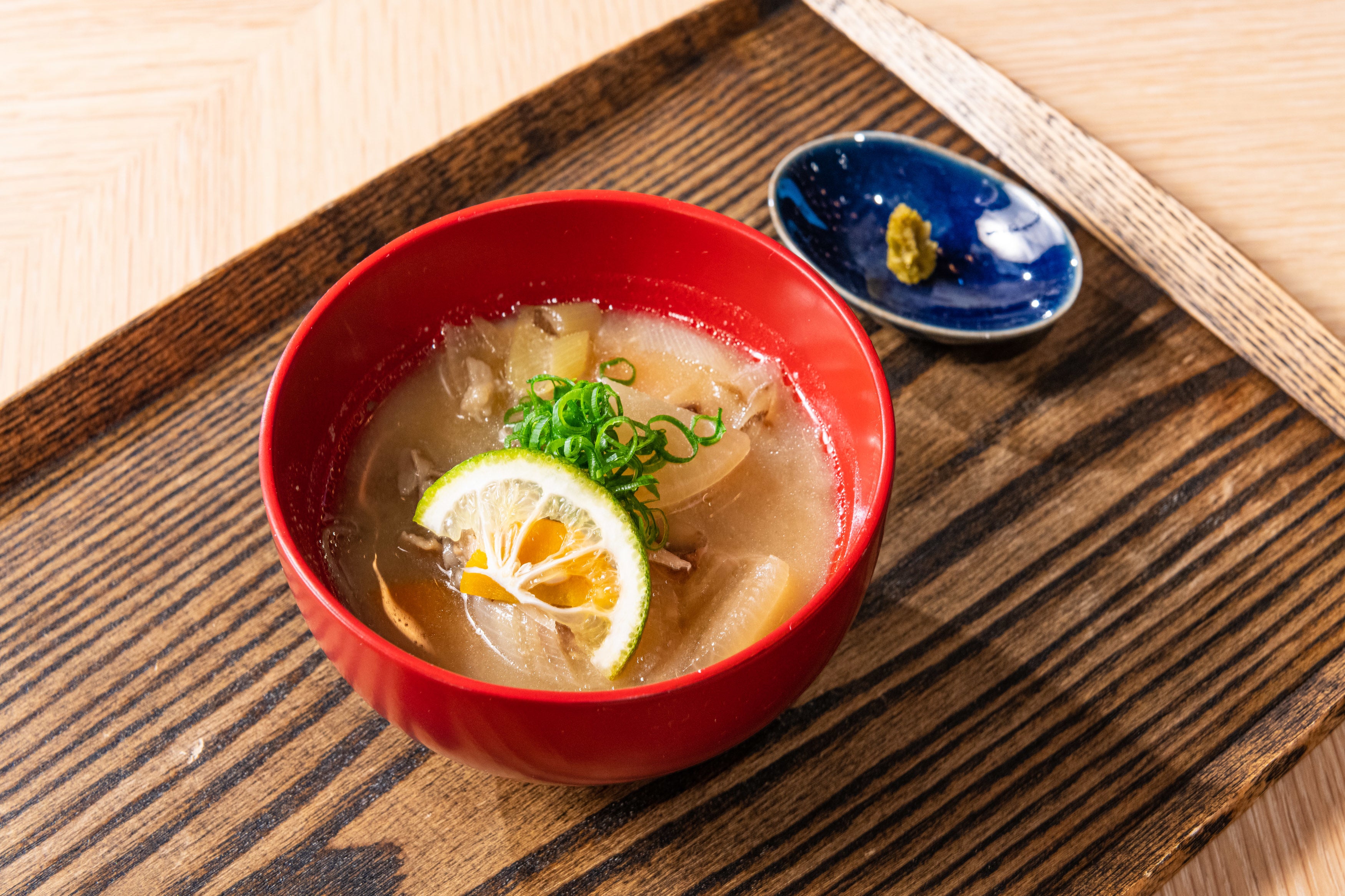 人参、こんにゃく、大根などの野菜と、もちもち食感の団子が楽しめる大分県のソウルフードである”団子汁”を坐来大分流に表現しました。土曜日限定でご提供しているコース「豊の郷」(5,500円)にてお召し上がりいただけます。