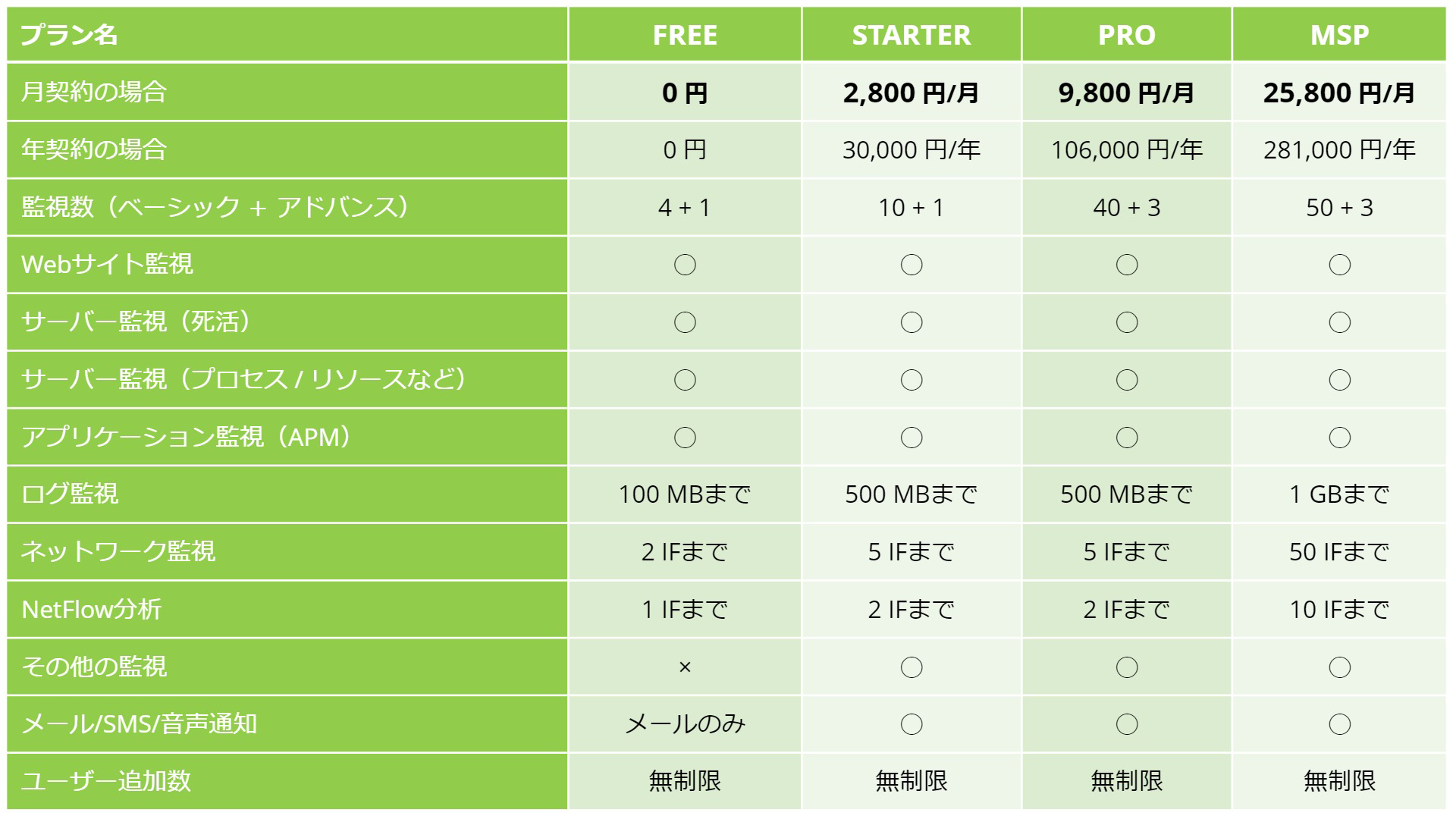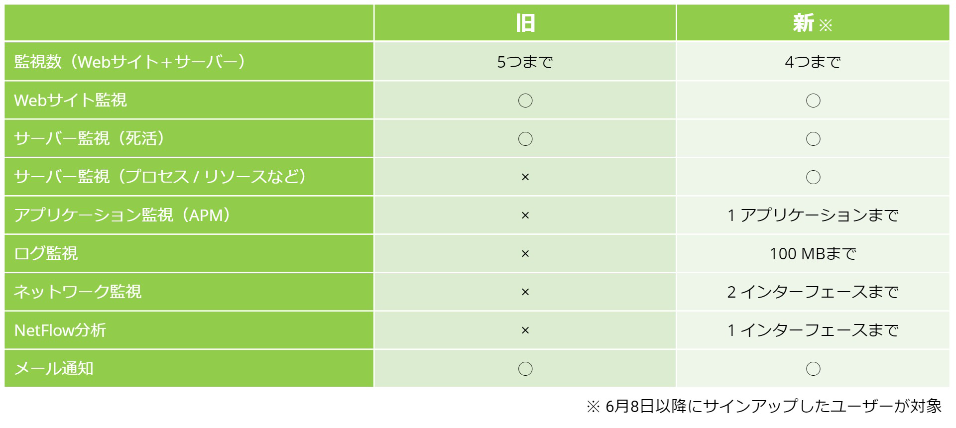 Site24x7無料プランの新旧機能比較は以下の通りです。