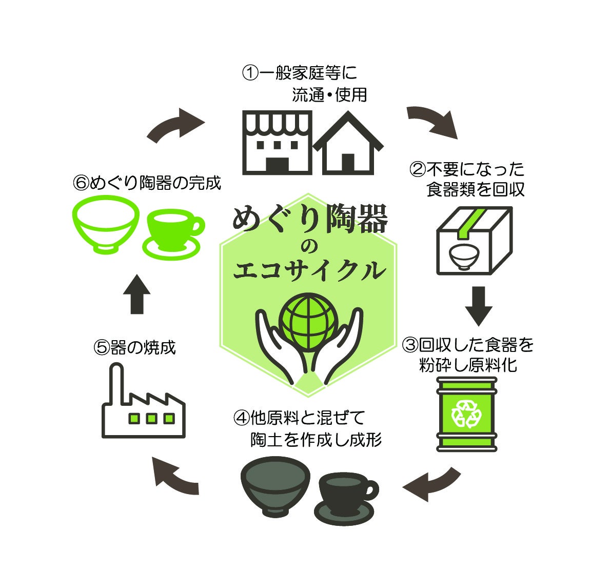 このRe-食器のサイクルはゴミ削減、埋立地拡大の抑制や天然資源である陶土の節約といった環境保全につながります。