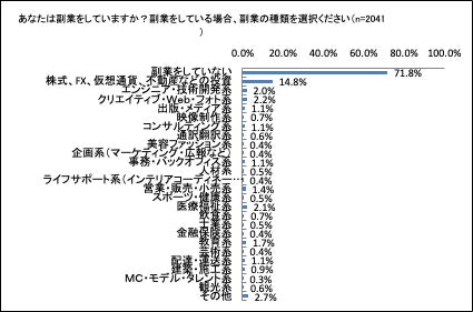 職種別に見ていくと、「クリエイティブ・Web・フォト系」が2.2%と最も多く、次いで「医療福祉系」が2.1%、「エンジニア・技術開発系」が2.0%がという結果となりました。その他、「株式、FX、仮想通貨、不動産などの投資」が14.8%でした。