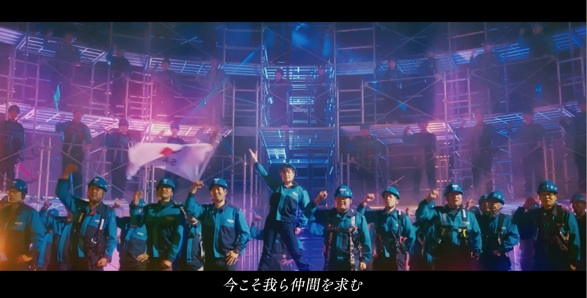 楽曲の冒頭でまず「我ら足場を組む者也」と自らの存在意義を高らかに宣言。低くどっしりとしたパーカッションのリズムにあわせて、工事現場の土台たる足場の存在を伝えます。続けて、基礎ゆえに目立たないけれど必要不可欠な存在である“足場”への誇りを、「その尊さを君はしっているかい?」「YES!」という掛け合いで描きました。高く拳を突き上げながら歌いあげる演出で、足場への強い想いを表現しています。そして後半、ミュージカルクライマックスでは曲調と雰囲気が一転、社員が肩を組み、社旗を翻しながら「今こそ我らは仲間を求む。君こそがきっとそのひとりになるのだ」と求人募集のメッセージを朗らかに伝え、未来への希望を感じさせる感動的な結末へとつなげました。