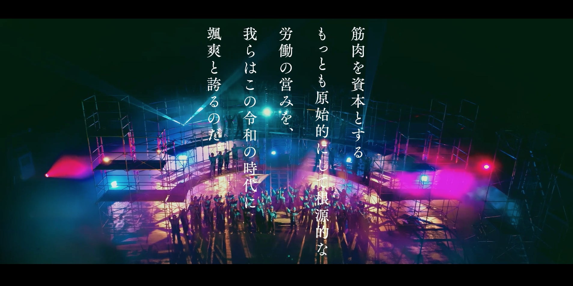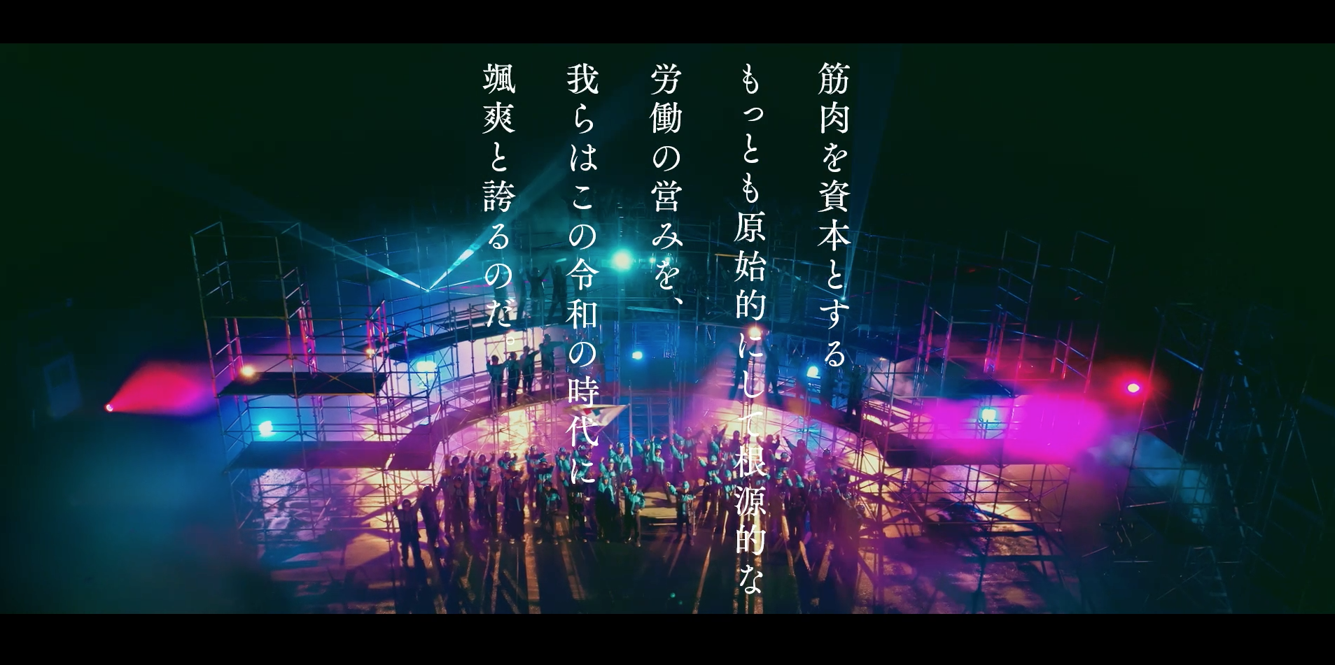 「筋肉を資本とするもっとも原始的にして根元的な労働の営みを颯爽と誇る」というメッセージはそのままに、当社ならではのモチーフである足場、そして“信義・信用・信念”という企業理念が組み合わさる形で、世界にも類を見ない求人募集ミュージカルが完成しました。