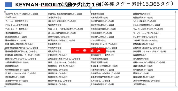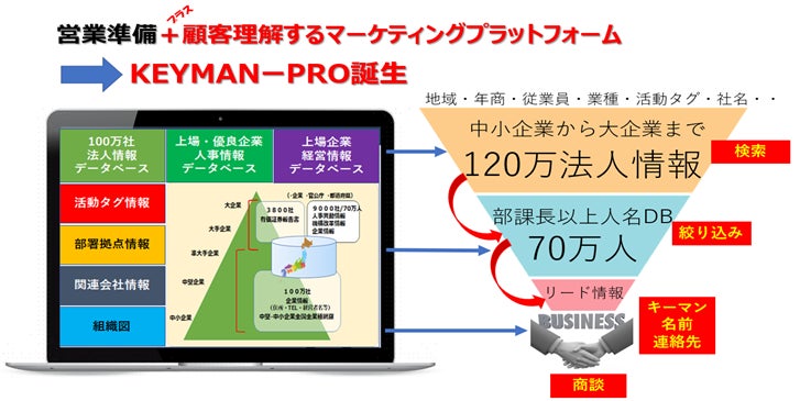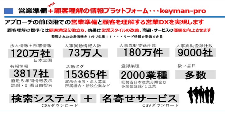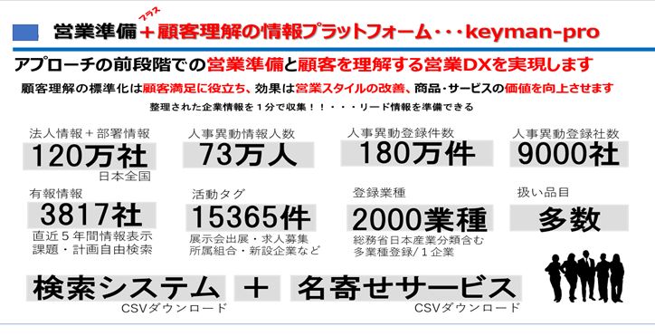 独自技術で2004年から国内法人情報500万社・人事異動情報+機構改革情報1万社・有価証券情報3800社のデータ収集蓄積と営業を支える営業準備・顧客理解を促進するプラットフォーム「KEYMAN-PRO」を製品化。